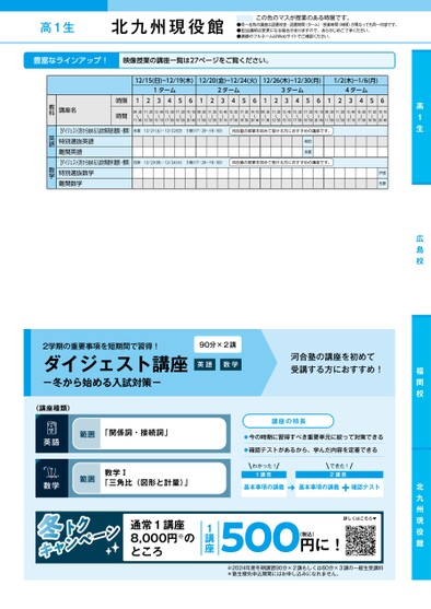 高1生●同一名称の講座は設置校舎・設置期間(ターム)・授業時間(時限)が異なっても同一内容です。●担当講師は変更になる場合がありますので、あらかじめご了承ください。●講師のフルネームはWebサイトでご確認ください。この色のマスが授業のある時限です。北九州現役館12/15(日)~12/19(木)12/20(金)~12/24(火)12/26(木)~12/30(月)1/2(木)~1/6(月)1ターム2ターム3ターム4ターム12345612345612345612345609:30〜11:0011:20〜12:5013:40〜15:1015:30〜17:0017:20〜18:5019:10〜20:4009:30〜11:0011:20〜12:5013:40〜15:1015:30〜17:0017:20〜18:5019:10〜20:4009:30〜11:0011:20〜12:5013:40〜15:1015:30〜17:0017:20〜18:5019:10〜20:4009:30〜11:0011:20〜12:5013:40〜15:1015:30〜17:0017:20〜18:5019:10〜20:40時限時間講座名【ダイジェスト】冬から始める入試対策英語(難関・標準)特別選抜英語難関英語【ダイジェスト】冬から始める入試対策数学(難関・標準)特別選抜数学難関数学永冨12/21(土)・12/22(日)5限(17:20〜18:50)2/21()・1/2()7:20~85012/23(月)・12/24(火)原1/23(・1/24(火)5限(17:20〜18:50)7:20~850河合塾の授業を初めて受ける方におすすめの講座です。柴田永冨河合塾の授業を初めて受ける方におすすめの講座です。戸田石原福岡校北九州現役館教科英語数学●2024年度/冬期講習/九州/北九州現役館/高1生/パターン14452024_57_7_745_31_20240711123204.csv/1ページ校了時削除