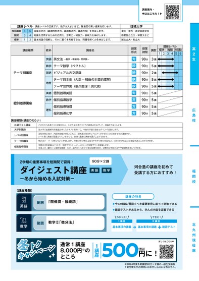 講座の特長今の時期に習得すべき重要単元に絞って対策できる確認テストがあるから、学んだ内容を定着できる英語数学数学Ⅱ「微分法」〈講座種類〉「関係詞・接続詞」2学期の重要事項を短期間で習得!ダイジェスト講座河合塾の講座を初めて受講する方におすすめ!90分×2講-冬から始める入試対策-英語数学基本事項の講義基本事項の講義確認テスト1講目2講目できた!わかった!※2024年度冬期講習90分×2講の一般生受講料*塾生優先申込期間にはお申し込みになれません。通常1講座8,000円※のところ1講座円に!(税込)500詳しくはこちら▼範囲範囲高2生広島校福岡校北九州現役館講座案内・申込はこちら!▶講座レベル特別選抜56標準12難関34講座レベル:講座レベルの目安です。数字が大きいほど、難易度の高い授業を行います。特別選抜難関標準531642高度な学力(論理的思考力、課題解決力、論述力等)を伸ばします。知識を活用するための応用力、思考力・判断力・表現力を伸ばします。基本知識の理解と、それに基づき考察する力、問題を解く力を伸ばします。目標大学東大・京大・医学部医学科難関国公立大・早慶大など国公立大・私立大講座種類テーマ別講座個別指導講座講座種類(講座のねらい)教科英語数学国語地歴英語数学理科講座名英文法-動詞・準動詞・関係詞-テーマ数学(ベクトル)ビジュアル古文常識テーマ日本史(大正―戦後の本質的理解)テーマ世界史(要点整理!現代史)個別指導英語個別指導数学個別指導物理個別指導化学授業形式対映映映映対対対対授業時間90分90分90分90分90分90分90分90分90分講数3講5講2講5講5講5講5講5講5講共通テスト講座大学別講座レベル別講座テーマ別講座個別指導講座この冬から共通テスト対策を行い、大学入学共通テストでの高得点をめざして、準備を万全にします。各大学の出題傾向を徹底分析したテキストを用いて、今後の学習の指針とポイントを提示します。現役合格に向け、内容を定着させるとともに、現時点の学力をレベルアップさせたい方におすすめの講座です。レベル別に講座が設置されていますので、自身に最適の講座を選ぶことができます。特定のテーマ・分野について学習します。得意分野の更なる強化や苦手分野の克服など、自身の目的に応じて講座を選ぶことができます。学習状況を把握したうえで、学習プランナーが一人ひとりの学習プランを提案します。生徒2名(最大)に個別指導員1名で、納得のいくまで丁寧な指導を受け、効果的な学習方法や学習習慣を身につけます。