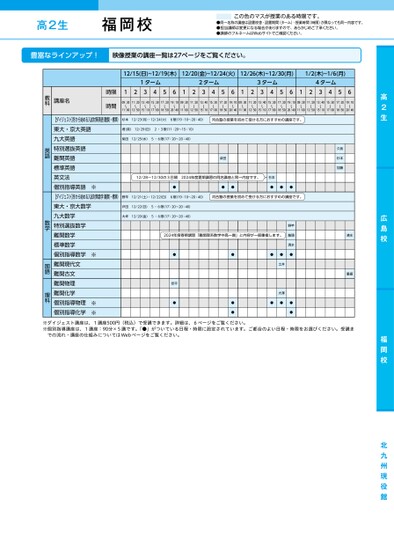 高2生●同一名称の講座は設置校舎・設置期間(ターム)・授業時間(時限)が異なっても同一内容です。●担当講師は変更になる場合がありますので、あらかじめご了承ください。●講師のフルネームはWebサイトでご確認ください。この色のマスが授業のある時限です。広島校福岡校12/15(日)~12/19(木)12/20(金)~12/24(火)12/26(木)~12/30(月)1/2(木)~1/6(月)1ターム2ターム3ターム4ターム12345612345612345612345609:30〜11:0011:20〜12:5013:40〜15:1015:30〜17:0017:20〜18:5019:10〜20:4009:30〜11:0011:20〜12:5013:40〜15:1015:30〜17:0017:20〜18:5019:10〜20:4009:30〜11:0011:20〜12:5013:40〜15:1015:30〜17:0017:20〜18:5019:10〜20:4009:30〜11:0011:20〜12:5013:40〜15:1015:30〜17:0017:20〜18:5019:10〜20:40時限時間講座名教科福岡校杉本12/23(月)・12/24(火)6限(19:10〜20:40)2/23月)・24(火)9:10~2040杉本河合塾の授業を初めて受ける方におすすめの講座です。12/29(日)(1/29(日)2・3限(11:20〜15:10)1:20~15:10堤)12/25(水)柴田12/25(水)5・6限(17:20〜20:40)17:20~20:40柴田柴田12/28~12/30の3日間2024年度夏期講習の同名講座と同一内容です。杉本●●●●●●12/21(土)・22(日)竿1/21(土)・12/22(日)6限(19:10〜20:40):10~2040野竿河合塾の授業を初めて受ける方におすすめの講座です。12/22(日)田1/22(日)5・6限(17:20〜20:40)1:20~0:0戸12/20(金)大坪12/20(金)5・6限(17:20〜20:40)17:20~20:40大坪2024年度春期講習「難関理系数学中高一貫」と内容が一部重複します。野竿龍頭清水●安平●●●●●●●土井大澤●●●●久我杉本加藤清水重盛※【ダイジェスト】冬から始める入試対策英語(難関・標準)東大・京大英語九大英語特別選抜英語難関英語標準英語英文法個別指導英語【ダイジェスト】冬から始める入試対策数学(難関・標準)東大・京大数学九大数学特別選抜数学難関数学標準数学個別指導数学難関現代文難関古文難関物理難関化学個別指導物理個別指導化学※※※英語数学国語理科※ダイジェスト講座は、1講座500円(税込)で受講できます。詳細は、6ページをご覧ください。※個別指導講座は、1講座:90分×5講です。「●」がついている日程・時限に設定されています。ご都合のよい日程・時限をお選びください。受講までの流れ・講座の仕組みについてはWebページをご覧ください。●2024年度/冬期講習/九州/福岡校/高2生/パターン14452024_57_7_711_32_20240710165137.csv/1ページ校了時削除
