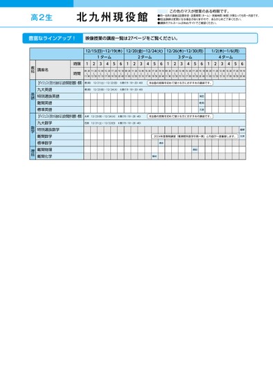 高2生●同一名称の講座は設置校舎・設置期間(ターム)・授業時間(時限)が異なっても同一内容です。●担当講師は変更になる場合がありますので、あらかじめご了承ください。●講師のフルネームはWebサイトでご確認ください。この色のマスが授業のある時限です。北九州現役館12/15(日)~12/19(木)12/20(金)~12/24(火)12/26(木)~12/30(月)1/2(木)~1/6(月)1ターム2ターム3ターム4ターム12345612345612345612345609:30〜11:0011:20〜12:5013:40〜15:1015:30〜17:0017:20〜18:5019:10〜20:4009:30〜11:0011:20〜12:5013:40〜15:1015:30〜17:0017:20〜18:5019:10〜20:4009:30〜11:0011:20〜12:5013:40〜15:1015:30〜17:0017:20〜18:5019:10〜20:4009:30〜11:0011:20〜12:5013:40〜15:1015:30〜17:0017:20〜18:5019:10〜20:40時限時間講座名堤(英)12/21(土)・12/22(日)6限(19:10〜20:40)22(土・1/22日19:1~0:40(英)12/23(月)・12/24(火)(1/23月)12/24(火)6限(19:10〜20:40)1:1~0:40(英)12/23(月)・12/24(火)坪1/23(・1/24(火)6限(19:10〜20:40)9:10~04012/21(土)・12/22(日)原1/21(・1/22(日)6限(19:10〜20:40)9:10~040【ダイジェスト】冬から始める入試対策英語(難関・標準)九大英語特別選抜英語難関英語標準英語【ダイジェスト】冬から始める入試対策数学(難関・標準)九大数学特別選抜数学難関数学標準数学難関物理難関化学河合塾の授業を初めて受ける方におすすめの講座です。柴田堤(英)久我河合塾の授業を初めて受ける方におすすめの講座です。2024年度春期講習「難関理系数学中高一貫」と内容が一部重複します。龍頭大坪清水野村原田教科英語数学理科●2024年度/冬期講習/九州/北九州現役館/高2生/パターン14452024_57_7_745_32_20240711123204.csv/1ページ校了時削除