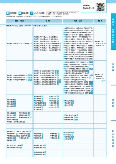 高3生・高卒生【冬期】広島校福岡校北九州現役館対対面授業映映像授業オオンライン授業ご自宅でタブレットやスマートフォン、パソコンなどで受講する「ライブ配信型」授業です。*映像授業の申込・受講方法は27ページをご覧ください。*オンライン授業の詳細は20ページをご覧ください。国語・小論文理科地歴・公民情報授業形式に関して詳しくは19ページをご覧ください。講座案内・申込はこちら!▶●共通テスト本番リハーサル情報Ⅰテスト●共通テスト傾向対策情報Ⅰテスト映※1●共通テスト本番リハーサル国語テスト●共通テスト本番リハーサル物理テスト●共通テスト本番リハーサル化学テスト●共通テスト本番リハーサル生物テスト●共通テスト本番リハーサル物理基礎テスト●共通テスト本番リハーサル化学基礎テスト●共通テスト本番リハーサル生物基礎テスト●共通テスト本番リハーサル地学基礎テスト●共通テスト傾向対策国語テスト対映●共通テスト傾向対策現代文テスト対映●共通テスト傾向対策古典テスト対映●共通テスト傾向対策物理テスト対映●共通テスト傾向対策化学テスト対映●共通テスト傾向対策生物テスト対映●共通テスト傾向対策物理基礎テスト映●共通テスト傾向対策化学基礎テスト対映●共通テスト傾向対策生物基礎テスト対映●共通テスト傾向対策地学基礎テスト映●共通テスト本番リハーサル歴史総合,日本史探究テスト●共通テスト本番リハーサル歴史総合,世界史探究テスト●共通テスト本番リハーサル歴史総合テスト●共通テスト本番リハーサル地理総合,地理探究テスト●共通テスト本番リハーサル地理総合テスト●共通テスト本番リハーサル公共,政治・経済テスト●共通テスト本番リハーサル公共,倫理テスト●共通テスト本番リハーサル公共テスト●共通テスト本番リハーサル日本史Bテスト(旧課程)●共通テスト本番リハーサル世界史Bテスト(旧課程)●共通テスト本番リハーサル地理Bテスト(旧課程)●共通テスト本番リハーサル現代社会テスト(旧課程)●共通テスト本番リハーサル倫理テスト(旧課程)●共通テスト本番リハーサル政治・経済テスト(旧課程)●共通テスト本番リハーサル倫理,政治・経済テスト(旧課程)●共通テスト傾向対策歴史総合,日本史探究テスト対映●共通テスト傾向対策歴史総合,世界史探究テスト映●共通テスト傾向対策歴史総合テスト映●共通テスト傾向対策地理総合,地理探究テスト(旧課程にも対応)対映●共通テスト傾向対策地理総整理対映●共通テスト傾向対策地理総合テスト映●共通テスト傾向対策公共,政治・経済テスト映●共通テスト傾向対策公共,倫理テスト映●共通テスト傾向対策公共テスト映●共通テスト傾向対策日本史Bテスト(旧課程)対映●共通テスト傾向対策世界史Bテスト(旧課程)対映●共通テスト傾向対策現代社会テスト(旧課程)映●共通テスト傾向対策倫理テスト(旧課程)映●共通テスト傾向対策政治・経済テスト(旧課程)映●共通テスト傾向対策倫理,政治・経済テスト(旧課程)対映●東大国語対●京大国語対●阪大国語対●九大国語対●早大現代文オ●西南大国語対●GMARCH現代文オ●早大国語対●早大古文オ●福大国語対●GMARCH古文オ●同志社・立命館大国語対●難関国公立大現代文(論述対策)対●難関現代文対●標準現代文対●難関国公立大古文(論述対策)対●難関古文対●難関漢文対●標準古文対●ビジュアル古文常識映●社会科学系小論文対●東大物理対●京大物理対●阪大物理対●広大医進物理対●広大医進化学対●九大物理対●九大生物対●東大化学対●京大化学対●阪大化学対●広大物理対●広大化学対●九大化学対●東大日本史対●東大世界史対●東大地理対●西南・福大日本史対●早慶大日本史対オ●早慶大世界史対オ●難関物理対●難関化学対●難関生物対●標準物理対●標準化学対●標準生物対●日本史論述対●日本史対オ●世界史論述対●世界史対オ●有機化学完成対●理論化学完成対●個別指導物理対●個別指導化学対