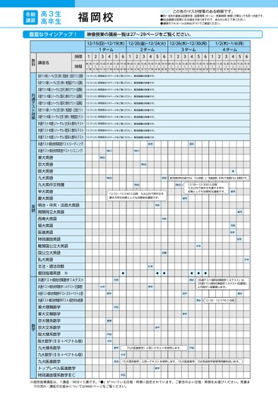 高3生高卒生冬期講習●同一名称の講座は設置校舎・設置期間(ターム)・授業時間(時限)が異なっても同一内容です。●担当講師は変更になる場合がありますので、あらかじめご了承ください。●講師のフルネームはWebサイトでご確認ください。この色のマスが授業のある時限です。12/15(日)~12/19(木)12/20(金)~12/24(火)12/26(木)~12/30(月)1/2(木)~1/6(月)1ターム2ターム3ターム4ターム12345612345612345612345609:30〜11:0011:20〜12:5013:40〜15:1015:30〜17:0017:20〜18:5019:10〜20:4009:30〜11:0011:20〜12:5013:40〜15:1015:30〜17:0017:20〜18:5019:10〜20:4009:30〜11:0011:20〜12:5013:40〜15:1015:30〜17:0017:20〜18:5019:10〜20:4009:30〜11:0011:20〜12:5013:40〜15:1015:30〜17:0017:20〜18:5019:10〜20:40時限時間講座名教科豊富なラインアップ!映像授業の講座一覧は27〜29ページをご覧ください。福岡校19ページをご覧ください。解説講義は映像です。12/31(火)時間割は●ペーを覧ください説像です12/31(火)時間割は●ページをご覧ください。解説講義は映像です。19ペーを覧ください説像です12/31(火)時間割は●ページをご覧ください。解説講義は映像です。19ペーを覧ください説像です12/31(火)時間割は●ページをご覧ください。解説講義は映像です。19ページをご覧ください。解説講義は映像です。12/31(火)時間割は●ページをご覧ください。解説講義は映像です。19ペーを覧ください説像です12/31(火)時間割は●ページをご覧ください。解説講義は映像です。19ペーを覧ください説像です12/31(火)時間割は●ページをご覧ください。解説講義は映像です。19ページをご覧ください。解説講義は映像です。12/31(火)時間割は●ページをご覧ください。解説講義は映像です。19ペーを覧ください説像です12/31(火)時間割は●ページをご覧ください。解説講義は映像です。19ペーを覧ください説像です12/31(火)時間割は●ページをご覧ください。解説講義は映像です。19ページをご覧ください。解説講義は映像です。柴田望月早﨑(ス)早﨑(ス)早﨑(由)早﨑(由)早﨑(由)柴田医学部医学科志望の方は、「九大英語」と「医進英語」を併せて受講すると効果的です。早﨑(由)12/22~12/24の3日間九大以外で英作文を課す大学の対策としても効果的な講座です。毛利早﨑(由)12/28~12/30の3日間九大以外で英作文を課す大学の対策としても効果的な講座です。望月望月浦毛利加藤杉本●●●●●望月堤(英)毛利堤(英)杉本清水「共通テスト傾向対策数学ⅠAテスト」は、「共通テスト傾向対策数学ⅠAテスト(旧課程)」と内容が一部重複します。清水12/26・12/27の2日間清水波平野竿杉本野竿波平大坪野竿●石原戸田龍頭戸田大坪野竿「九大医進数学」と同一テキストを使用します。戸田大坪吉浪「九大理系数学」と同一テキストを使用します。「九大医進数学」では別途医学部専用問題を扱います。野竿戸田共通テスト本番リハーサル(文系3教科/英国地歴・公民型)テスト(旧課程)共通テスト本番リハーサル(文系3教科/英数国型)テスト(旧課程)共通テスト本番リハーサル(文系5教科)テスト(旧課程)共通テスト本番リハーサル(理系3教科)テスト(旧課程)共通テスト本番リハーサル(理系5教科)テスト(旧課程)共通テスト本番リハーサル(文系3教科/英国地歴・公民型)テスト共通テスト本番リハーサル(文系3教科/英数国型)テスト共通テスト本番リハーサル(文系6教科)テスト共通テスト本番リハーサル(理系3教科)テスト共通テスト本番リハーサル(理系6教科)テスト共通テスト傾向対策英語テスト(リーディング)共通テスト傾向対策英語テスト(リスニング)東大英語京大英語阪大英語九大英語九大英作文特講早大英語慶大英語明治・中央・法政大英語関関同立大英語西南大英語福大英語医進英語特別選抜英語難関国公立大英語国公立大英語私大英語文法・語法攻略個別指導英語共通テスト傾向対策数学ⅠAテスト共通テスト傾向対策数学ⅠAテスト(旧課程)共通テスト傾向対策数学テスト(ⅡB+ベクトル型)共通テスト傾向対策数学テスト(統計的な推測)東大理類数学東大文類数学京大理系数学京大文系数学阪大理系数学阪大数学(ⅡB+ベクトル型)九大理系数学九大数学(ⅡB+ベクトル型)九大医進数学トップレベル医進数学特別選抜理系数学ⅢC※共通テスト対策英語数学※個別指導講座は、1講座:90分×5講です。「●」がついている日程・時限に設定されています。ご都合のよい日程・時限をお選びください。受講ま校了時削除●2024年度/冬期講習/九州/福岡校/高3・卒生/パターン14452024_57_7_711_11_20240710203029.csv/1ページでの流れ・講座の仕組みについてはWebページをご覧ください。