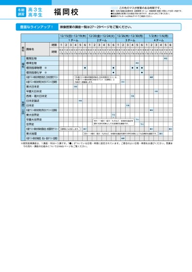 高3生高卒生冬期講習●同一名称の講座は設置校舎・設置期間(ターム)・授業時間(時限)が異なっても同一内容です。●担当講師は変更になる場合がありますので、あらかじめご了承ください。●講師のフルネームはWebサイトでご確認ください。この色のマスが授業のある時限です。12/15(日)~12/19(木)12/20(金)~12/24(火)12/26(木)~12/30(月)1/2(木)~1/6(月)1ターム2ターム3ターム4ターム12345612345612345612345609:30〜11:0011:20〜12:5013:40〜15:1015:30〜17:0017:20〜18:5019:10〜20:4009:30〜11:0011:20〜12:5013:40〜15:1015:30〜17:0017:20〜18:5019:10〜20:4009:30〜11:0011:20〜12:5013:40〜15:1015:30〜17:0017:20〜18:5019:10〜20:4009:30〜11:0011:20〜12:5013:40〜15:1015:30〜17:0017:20〜18:5019:10〜20:40時限時間講座名※※難関生物標準生物個別指導物理個別指導化学共通テスト傾向対策歴史総合,日本史探究テスト共通テスト傾向対策日本史Bテスト(旧課程)東大日本史早慶大日本史西南・福大日本史日本史論述日本史共通テスト傾向対策世界史Bテスト(旧課程)東大世界史早慶大世界史世界史共通テスト傾向対策地理総合,地理探究テスト東大地理共通テスト傾向対策倫理,政治・経済テスト(旧課程)●●●「共通テスト傾向対策歴史総合,日本史探求テスト」は、「共通テスト傾向対策日本史Bテスト(旧課程)」と内容が一部重複します。古川中垣中垣岸田岸田●●●●大髙梅野植松大髙大髙下川京大・一橋大・阪大・九大など、本格的な論述を課す大学の対策としても効果的な講座です。下川下川旧課程にも対応します。子瀬川瀬川京大・一橋大・阪大・九大など、本格的な論述を課す大学の対策としても効果的な講座です。瀬川梅野教科理科地歴・公民※個別指導講座は、1講座:90分×5講です。「●」がついている日程・時限に設定されています。ご都合のよい日程・時限をお選びください。受講までの流れ・講座の仕組みについてはWebページをご覧ください。福岡校●2024年度/冬期講習/九州/福岡校/高3・卒生/パターン14452024_57_7_711_11_20240710203029.csv/3ページ校了時削除