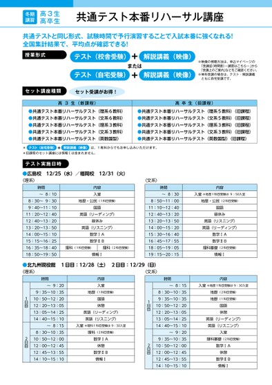 高3生高卒生冬期講習●同一名称の講座は設置校舎・設置期間(ターム)・授業時間(時限)が異なっても同一内容です。●担当講師は変更になる場合がありますので、あらかじめご了承ください。●講師のフルネームはWebサイトでご確認ください。この色のマスが授業のある時限です。共通テスト本番リハーサル講座共通テストと同じ形式、試験時間で予行演習することで入試本番に強くなれる!全国集計結果で、平均点が確認できる!授業形式テスト(校舎受験)解説講義(映像)テスト(自宅受験)解説講義(映像)「受講証(時間割)-講習はこちら-」から「受講上のご案内」などをご確認ください。※映像の視聴方法は、申込マイページの※単科受講の場合は、テスト・解説講義ともに自宅受講です。または++セット講座種類セット受講がお得!高3生(新課程)高卒生(旧課程)●共通テスト本番リハーサルテスト(理系6教科)●共通テスト本番リハーサルテスト(文系6教科)●共通テスト本番リハーサルテスト(理系3教科)●共通テスト本番リハーサルテスト(文系3教科)●共通テスト本番リハーサルテスト(英数国型)●共通テスト本番リハーサルテスト(理系5教科)(旧課程)●共通テスト本番リハーサルテスト(文系5教科)(旧課程)●共通テスト本番リハーサルテスト(理系3教科)(旧課程)●共通テスト本番リハーサルテスト(文系3教科)(旧課程)●共通テスト本番リハーサルテスト(英数国型)(旧課程)テスト(自宅受験)*は、1教科からでもお申し込みいただけます。*旧課程のセット講座には情報Ⅰは含まれません。+解説講義(映像)テスト実施日時●広島校12/25(水)/福岡校12/31(火)〈理系〉〈文系〉時間~8:108:30~9:309:40~11:1011:20~12:4012:40~13:2013:20~13:5014:00~15:1015:15~16:2516:35~18:4018:50~19:50内容入室地歴・公民(1科目受験)国語英語(リーディング)昼休み英語(リスニング)数学ⅠA数学ⅡB理科(1科目受験)理科(2科目受験)情報Ⅰ時間~8:308:50~11:0011:10~12:4012:40~13:2013:20~13:5014:00~15:2015:30~16:4016:45~17:5518:05~19:0519:15~20:15内容入室※地歴1科目受験は9:50入室地歴・公民(2科目受験)国語昼休み英語(リスニング)英語(リーディング)数学ⅠA数学ⅡB理科基礎(2科目受験)情報Ⅰ●北九州現役館1日目:12/28(土)2日目:12/29(日)〈理系〉〈文系〉内容入室※地歴1科目受験は9:30入室地歴(2科目受験)地歴(1科目受験)国語休憩英語(リーディング)英語(リスニング)入室理科基礎(2科目受験)数学ⅠA休憩数学ⅡB情報Ⅰ時間~8:158:30~10:359:35~10:3510:50~12:2012:20~13:0513:05~14:2514:40~15:10~9:209:35~10:3510:50~12:0012:00~12:4512:45~13:5514:10~15:101日目2日目内容入室地歴(1科目受験)国語休憩英語(リーディング)英語(リスニング)入室※理科1科目受験は9:30入室理科(2科目受験)数学ⅠA休憩数学ⅡB情報Ⅰ時間~9:209:35~10:3510:50~12:2012:20~13:0513:05~14:2514:40~15:10~8:158:30~10:3510:50~12:0012:00~12:4512:45~13:5514:10~15:101日目2日目