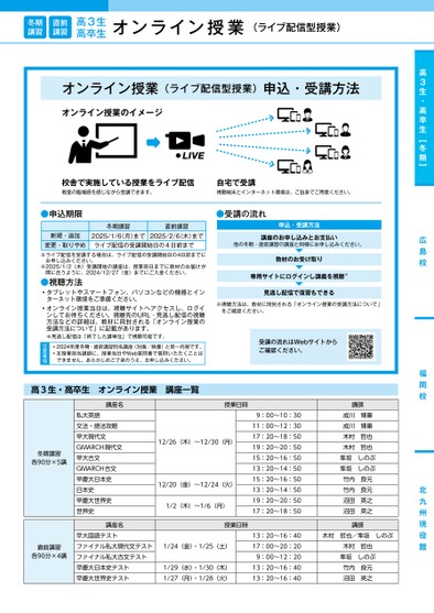 高3生・高卒生【冬期】広島校福岡校北九州現役館冬期講習直前講習高3生高卒生オンライン授業(ライブ配信型授業)オンライン授業(ライブ配信型授業)申込・受講方法オンライン授業のイメージ校舎で実施している授業をライブ配信教室の臨場感を感じながら受講できます。自宅で受講視聴端末とインターネット環境は、ご自身でご用意ください。●申込期限●受講の流れ冬期講習直前講習新規・追加変更・取りやめ2025/1/6(月)までライブ配信の受講開始日の4日前まで2025/2/6(木)まで申込・受講方法講座のお申し込みとお支払い他の冬期・直前講習の講座と同様にお申し込みください。教材のお受け取り専用サイトにログインし講義を視聴※見逃し配信で復習もできる※視聴方法は、教材に同封される「オンライン授業の受講方法について」をご確認ください。受講の流れはWebサイトからご確認ください。※ライブ配信を受講する場合は、ライブ配信の受講開始日の4日前までにお申し込みください。※2025/1/2(木)受講開始の講座は、授業前日までに教材のお届けが間に合うように、2024/12/27(金)までにご入金ください。タブレットやスマートフォン、パソコンなどの機器とインターネット環境をご準備ください。オンライン授業当日は、視聴サイトへアクセスし、ログインしてお待ちください。視聴先のURL・見逃し配信の視聴方法などの詳細は、教材に同封される「オンライン授業の受講方法について」に記載があります。※見逃し配信は「終了した講単位」で視聴可能です。2024年度冬期・直前講習同名講座(対面/映像)と同一内容です。本授業担当講師に、授業当日やWeb質問書で質問いただくことはできません。あらかじめご了承のうえ、お申し込みください。注意事項高3生・高卒生オンライン授業講座一覧●視聴方法冬期講習各90分×5講講座名私大英語文法・語法攻略早大現代文GMARCH現代文早大古文GMARCH古文早慶大日本史日本史早慶大世界史世界史講座名授業日時12/26(木)~12/30(月)12/20(金)~12/24(火)1/2(木)~1/6(月)授業日時直前講習各90分×4講早大国語テストファイナル私大現代文テストファイナル私大古文テスト早慶大日本史テスト早慶大世界史テスト1/24(金)・1/25(土)1/29(水)・1/30(木)1/27(月)・1/28(火)9:00~10:3011:00~12:3017:20~18:5019:20~20:5015:20~16:5013:20~14:5015:20~16:5013:20~14:5019:20~20:5017:20~18:5013:20~16:4017:00~20:209:00~12:2013:20~16:4013:20~16:40講師成川博康成川博康木村哲也木村哲也隼坂しのぶ隼坂しのぶ竹内良元竹内良元沼田英之沼田英之講師木村哲也/隼坂しのぶ木村哲也隼坂しのぶ竹内良元沼田英之