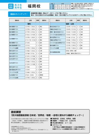 高3生高卒生直前講習●同一名称の講座は設置校舎・設置期間・授業時間(時限)・授業形式(対面・映像)が異なっても同一内容です。●担当講師は変更になる場合がありますので、あらかじめご了承ください。●講師のフルネームはWebサイトでご確認ください。時限時間1・2限3・4限5・6限9:30〜11:00・11:20〜12:5013:40〜15:10・15:30〜17:0017:20〜18:50・19:10〜20:40福岡校九大数学テスト(ⅡB+ベクトル型)2/11(火・祝)・2/12(水)大化テスト13木)2/14金)5・6大坪九工大数学テスト2/13(木)・2/14(金)5・6石原ハイレベル医進数学テスト九大化学テストファイナル国公立大理系数学テスト1/24(金)・1/25(土)5・6龍頭2/19(水)・2/20(木)3・4龍頭ファイナル国公立大数学テスト(ⅡB+ベクトル型)2/17(月)・2/18(火)化学テスト3・4大坪ファイナル数学ⅢC2/9(日)・2/10(月)(水)3・4波平ファイナル数学(ⅡB+ベクトル型)2/5(水)・2/6(木)ァイル化学(金)・/5土)5・6大坪講座名日程時限講師名東大物理テスト京大物理テスト阪大物理テスト広大物理テスト九大物理テスト理科1/27(月)・1/28(火)5・6原田1/27(月)・1/28(火)5・6本村2/17(月)・2/18(火)5・6本村2/15(土)・2/16(日)5・6安平1/27(月)・1/28(火)3・4本村2/11(火・祝)・2/12(水)5・6原田熊大物理テスト福大医進物理テスト2/13(木)1/21(火)3・4宮本5・6本村ファイナル物理東大化学テスト京大化学テスト阪大化学テスト広大化学テスト九大化学テスト1/27(月)・1/28(火)3・4原田1/24(金)・1/25(土)3・4大澤1/31(金)・2/1(土)3・4大澤2/13(木)・2/14(金)3・4大澤2/13(木)・2/14(金)5・6野村1/24(金)・1/25(土)3・4野村2/13(木)・2/14(金)5・6大澤九大生物テスト講座名2/5(水)・2/6(木)国語日程5・6時限5・6野黒美土井講師名ファイナル国公立大現代文テストァイナル生物2/7(金)・2/8(土)(月)・/8火)ファイナル私大現代文テスト1/22(水)・1/23(木)地歴・公民理科5・6土井ファイナル国公立大古文テスト大物理テスト2/13(木)・2/14(金)3・4重盛ファイナル私大古文テスト1/24(金)・1/25(土)5・6重盛阪大物理テスト史テスト2/17(月)・2/18(火)理科5・6本村九大物理テストナル私大日本史テスト1/29(水)・1/30(木)5・6本村ファイナル物理ト九大物理テスト九大化学テストスト2/17(月)・2/18(火)土)3・4宮本1/29(水)・1/30(木)11(・)・2/1(水)5・6大澤ファイナル化学ナル私大世界史テスト1/24(金)・1/25(土)3・4山本ファイナル生物スト1/22(水)・1/23(木)5・6野黒美ファイナル物理東大化学テスト京大地歴直前添削京大化学テスト阪大化学テスト広大化学テスト九大化学テスト地歴・公民1/27(月)・1/28(火)3・4原田日本史/世界史/地理/24(金)・1/2(3・4大澤※詳細は、右ページをご覧ください。/31(金)・2/1土)覧。3・42/13(木)・2/14(金)3・4大澤2/13(木)・2/14(金)5・6野村1/24(金)・1/25(土)3・4野村2/13(木)・2/14(金)5・6大澤熊大化学テスト福大医進化学テスト2/14(金)1/22(水)3・4野村5・6馬場熊大化学テスト福大医進化学テスト2/14(金)1/22(水)3・4野村5・6馬場1/24(金)・1/25(土)3・4山本1ページ2/5(水)・2/6(木)5・6野黒美1/27(月)・1/28(火)5・6岸田地歴・公民ファイナル化学●2024年度/直前講習/九州/北九州現役館/高3・卒生/パターン7043/2024_1/24(金)・1/25(土)3・4山本九大生物テストファイナル生物2/5(水)・2/6(木)5・6野黒美1/27(月)・1/28(火)5・6岸田地歴・公民1/20(月)・1/21(火)3・4中垣東大日本史テスト1/20(月)・1/21(火)3・4中垣1/20(月)・1/21(火)3・4大髙2ページ早慶大日本史テスト●2024年度/直前講習/九州/福岡校/高3・卒生/パターン7043/2024_59_7_71/20(月)・1/21(火)3・4大髙ファイナル化学九大生物テストファイナル生物東大日本史テスト早慶大日本史テスト西南・福大日本史テスト1/22(水)・1/23(木)3・4大髙西南・福大日本史テスト1/22(水)・1/23(木)3・4大髙ファイナル私大日本史テスト1/29(水)・1/30(木)3・4梅野ファイナル私大日本史テスト1/29(水)・1/30(木)3・4梅野東大世界史テスト早慶大世界史テスト1/31(金)・2/1(土)5・6下川1/24(金)・1/25(土)5・6下川東大世界史テスト早慶大世界史テスト1/31(金)・2/1(土)5・6下川1/24(金)・1/25(土)5・6下川ファイナル私大世界史テスト1/24(金)・1/25(土)3・4下川ファイナル私大世界史テスト1/24(金)・1/25(土)3・4下川東大地理テストファイナル地理1/27(月)・1/28(火)5・6瀬川1/27(月)・1/28(火)3・4瀬川東大地理テストファイナル地理1/27(月)・1/28(火)5・6瀬川1/27(月)・1/28(火)3・4瀬川直前講習「京大地歴直前添削日本史/世界史/地理-自宅に居ながら最終チェック-」2025年度の京大入試を大胆に予想したオリジナルテスト問題(2回分)を用意し、客観的な問題の最終確認と論述部分の丁寧な添削指導で、合格答案作成を確実なものにします。※解説講義は行いません。※添削した答案は後日郵送返却します。※直前講習「京大日本史テスト」「京大世界史テスト」「京大地理テスト」と同一教材です。■実施科目日本史,世界史,地理■受講料1科目につき3,000円■申込受付締切日2/1(土)■スケジュール1月下旬より課題を郵送配付(2回分同時配付)〈詳細スケジュールは課題配付時にご連絡いたします。〉