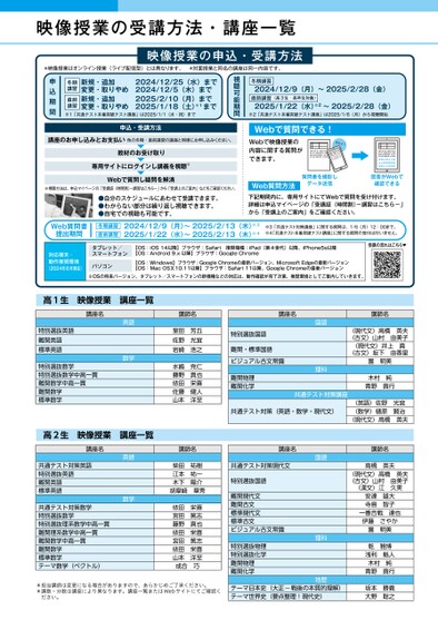 冬期講習2024/12/9(月)〜2025/2/28(金)直前講習(高3生・高卒生対象)2025/1/22(水)※2〜2025/2/28(金)※2「共通テスト本番突破テスト講座」は2025/1/6(月)から視聴開始視聴可能期間申込期間冬期講習新規・追加2024/12/25(水)まで変更・取りやめ2024/12/5(木)まで新規・追加2025/2/10(月)まで変更・取りやめ2025/1/18(土)※1まで直前講習※1「共通テスト本番突破テスト講座」は2025/1/1(水・祝)まで申込・受講方法講座のお申し込みとお支払い他の冬期・直前講習の講座と同様にお申し込みください。教材のお受け取り専用サイトにログインし講義を視聴※Webで質問し疑問を解消※視聴方法は、申込マイページの「受講証(時間割)-講習はこちら-」から「受講上のご案内」などをご確認ください。●自分のスケジュールにあわせて受講できます。●わからない部分は繰り返し視聴できます。●自宅での視聴も可能です。Webで質問できる!Webで映像授業の内容に関する質問ができます。カシャ!Web質問方法質問書を撮影しデータ送信回答がWebで確認できる下記期間内に、専用サイトにてWebで質問を受け付けます。詳細は申込マイページの「受講証(時間割)-講習はこちら-」から「受講上のご案内」をご確認ください。Web質問書提出期間冬期講習直前講習2024/12/9(月)〜2025/2/13(木)※32025/1/22(水)〜2025/2/13(木)※4※3「共通テスト対策講座」に関する質問は、1/6(月)12:00まで。※4「共通テスト本番突破テスト講座」に関する質問の受付は行いません。対応端末・動作推奨環境(2024年8月現在)タブレット/スマートフォンパソコン【OS:iOS14以降】ブラウザ:Safari推奨機種:iPad(第4世代)以降、iPhone5s以降【OS:Android9.x以降】ブラウザ:GoogleChrome【OS:Windows】ブラウザ:GoogleChromeの最新バージョン、MicrosoftEdgeの最新バージョン【OS:MacOSⅩ10.11以降】ブラウザ:Safari11以降、GoogleChromeの最新バージョン※OSの将来バージョン、タブレット/スマートフォンの新機種などの対応は、動作確認が完了次第、推奨環境としてご案内していきます。受講の流れはこちら▼映像授業の受講方法・講座一覧*映像授業はオンライン授業(ライブ配信型)とは異なります。*対面授業と同名の講座は同一内容です。映像授業の申込・受講方法高1生映像授業講座一覧英語数学講座名特別選抜英語難関英語標準英語特別選抜数学特別選抜数学中高一貫難関数学中高一貫難関数学標準数学高2生映像授業講座一覧英語数学講座名共通テスト対策英語特別選抜英語難関英語標準英語共通テスト対策数学特別選抜数学特別選抜理系数学中高一貫難関理系数学中高一貫難関数学中高一貫難関数学標準数学テーマ数学(ベクトル)講師名室田芳丘佐野光宜岩崎浩之水嶋克仁藤野真也依田栄喜佐藤健人山本洋至講師名柴田祐樹江本祐一木下陽介胡摩﨑章秀依田栄喜宮田篤志藤野真也依田栄喜宮田篤志依田栄喜山本洋至成合巧*担当講師は変更になる場合がありますので、あらかじめご了承ください。*講数・分数は講座により異なります。講座一覧またはWebサイトにてご確認ください。講座名特別選抜国語難関・標準国語ビジュアル古文常識難関物理難関化学講座名共通テスト対策現代文特別選抜国語難関現代文難関古文標準現代文標準古文ビジュアル古文常識特別選抜物理特別選抜化学難関物理難関化学国語理科国語理科地歴講師名(現代文)高橋英夫(古文)山村由美子(現代文)井上真(古文)坂下由香里園明美木村純青野貴行(英語)佐野光宜(数学)樋原賢治(現代文)高橋英夫講師名高橋英夫(現代文)高橋英夫(古文)山村由美子(漢文)江久実安達雄大寺島智子一番合戦達也伊藤さやか園明美乾雅博浅利魁人木村純青野貴行坂本勝義大野聡之共通テスト対策講座共通テスト対策(英語・数学・現代文)テーマ日本史(大正―戦後の本質的理解)テーマ世界史(要点整理!現代史)
