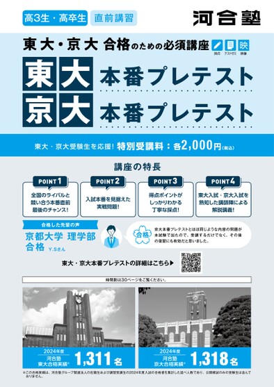 高3生・高卒生直前講習東大・京大合格のための必須講座映映像採点テストゼミ東大京大本番プレテスト本番プレテスト東大・京大受験生を応援!特別受講料:各2,000円(税込)講座の特長POINT1POINT2全国のライバルと競い合う本番直前最後のチャンス!入試本番を見据えた実戦問題!POINT3得点ポイントがしっかりわかる丁寧な採点!POINT4東大入試・京大入試を熟知した講師陣による解説講義!合格した先輩の声京都大学理学部合格Y.Sさん合格京大本番プレテストとほぼ同じような内容の問題が本試験で出たので、受講するだけでなく、その後の復習にも有効だと思いました。東大・京大本番プレテストの詳細はこちら▼時間割は30ページをご覧ください。2024年度河合塾東大合格実績※1,311名2024年度河合塾京大合格実績※1,318名※この合格実績は、河合塾グループ関連法人の在籍生および講習受講生の2024年度入試の合格者を集計した延べ人数であり、公開模試のみの受験生は含んでおりません。