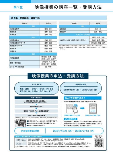 高1生映像授業の講座一覧・受講方法高1生映像授業講座一覧講座名英語数学国語特別選抜英語難関英語標準英語特別選抜数学特別選抜数学中高一貫難関数学中高一貫難関数学標準数学特別選抜国語難関・標準国語ビジュアル古文常識講師名室田芳丘佐野光宜岩崎浩之水嶋克仁藤野真也依田栄喜佐藤健人山本洋至(現代文)高橋英夫(古文)山村由美子(現代文)井上真(古文)坂下由香里園明美講座名理科難関物理難関化学共通テスト対策講座共通テスト対策(英語・数学・現代文)講師名木村純青野貴行(英語)佐野光宜(数学)樋原賢治(現代文)高橋英夫*担当講師は変更になる場合がありますので、あらかじめご了承ください。*講数・分数は講座により異なります。講座一覧またはWebサイトにてご確認ください。映像授業の申込・受講方法申込期間視聴可能期間新規・追加2024/12/25(水)まで変更・取りやめ2024/12/5(木)まで2024/12/9(月)〜2025/2/28(金)申込・受講方法講座のお申し込みとお支払い他の冬期講習の講座と同様にお申し込みください。教材のお受け取り専用サイトにログインし講義を視聴※Webで質問できる!Webで映像授業の内容に関する質問ができます。カシャ!Webで質問し疑問を解消質問書を撮影しデータ送信回答がWebで確認できる※視聴方法は、申込マイページの「受講証(時間割)ー講習はこちらー」から「受講上のご案内」などをご確認ください。●自分のスケジュールにあわせて受講できます。●わからない部分は繰り返し視聴できます。●自宅での視聴も可能です。Web質問方法下記期間内に、専用サイトにてWebで質問を受け付けます。詳細は申込マイページの「受講証(時間割)ー講習はこちらー」から「受講上のご案内」をご確認ください。Web質問書提出期間2024/12/9(月)〜2025/2/13(木)対応端末・動作推奨環境(2024年8月現在)タブレット/スマートフォンパソコン【OS:iOS14以降】ブラウザ:Safari推奨機種:iPad(第4世代)以降、iPhone5s以降【OS:Android9.x以降】ブラウザ:GoogleChrome【OS:Windows】ブラウザ:GoogleChromeの最新バージョン、MicrosoftEdgeの最新バージョン【OS:MacOSⅩ10.11以降】ブラウザ:Safari11以降、GoogleChromeの最新バージョン※OSの将来バージョン、タブレット/スマートフォンの新機種などの対応は、動作確認が完了次第、推奨環境としてご案内していきます。受講の流れはこちら▼