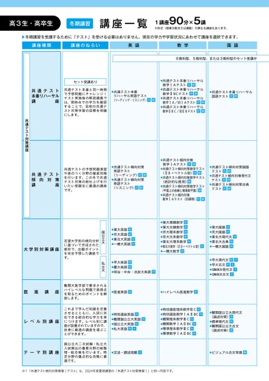 高3生・高卒生冬期講習講座一覧1講座90分×5講※形式(授業分数または講数)の異なる講座もあります。▶冬期講習を受講するために「テスト」を受ける必要はありません。現在の学力や学習状況にあわせて講座を選択できます。講座種類講座のねらい英語数学国語6教科型、5教科型、または3教科型のセット受講が共通テスト本番リハーサル講座セット受講あり共通テスト本番と同一時間で予想問題にチャレンジ!テスト実施後の解説講義では、現時点での学力を確認することで、目前の共通テスト対策学習の目標を明確にします。●共通テスト本番リハーサル英語テスト(リーディング・リスニング)対映●共通テスト本番リハーサル数学ⅠAテスト対映●共通テスト本番リハーサル数学ⅡBCテスト対映●共通テスト本番リハーサル数学ⅠA/旧ⅠAテスト対映●共通テスト本番リハーサル数学ⅡBC/旧ⅡBテスト対映●共通テスト本番リハーサル国語テスト対映共通テスト対策講座●共通テスト傾向対策数学ⅠAテスト対映●共通テスト傾向対策数学テスト(ⅡB+ベクトル型)対映●共通テスト傾向対策数学テスト(統計的な推測)映●共通テスト傾向対策数学テスト(平面上の曲線と複素数平面)映●共通テスト傾向対策数学ⅠAテスト(旧課程)対映●東大理類数学対●東大文類数学対●京大理系数学対●京大文系数学対●東北大理系数学対●東北大数学(ⅡB+ベクトル型)対●一橋大数学対●共通テスト傾向対策国語テスト対映●共通テスト傾向対策現代文テスト対映●共通テスト傾向対策古典テスト対映●東大国語対●京大国語対●東北大現代文対●東北大古典対●一橋大国語対●早大現代文対オ●早大古文対オ●GMARCH現代文オ●GMARCH古文オ共通テスト策傾講座座向対共通テストの予想問題演習や差のつく分野の徹底攻略を行います。この冬で共通テスト対策の総仕上げを行いたい受験生に最適の講座です。●共通テスト傾向対策英語テスト(リーディング)対映●共通テスト傾向対策英語テスト(リスニング)対映●東大英語対●京大英語対●東北大英語対●一橋大英語対●早大英語対●慶大英語対●明治・中央・法政大英語対国公立大私立大大学別対策講座志望大学別の傾向分析に基づいて作成された教材で、出題ポイントを完全予想した講座です。医進講座レベル別講座テーマ別講座難関大医学部で要求されるハイレベルな問題で高得点を取るためのポイントを解説します。これまで学んだ知識を定着させるとともに、入試に対応できる総合的な学力を身につけます。レベル別に講座が設置されていますので、自身に最適の講座を選ぶことができます。国公立大二次試験・私立大入試頻出の重要分野の総整理・総点検を行います。特定分野の重点的な攻略に最適です。●医進英語対●ハイレベル医進数学対●特別選抜英語対●難関国公立大英語対●国公立大英語対●私大英語対オ●特別選抜理系数学ⅢC対●特別選抜数学ⅠAⅡBC対●難関理系数学ⅢC対●難関数学ⅠAⅡBC対●標準理系数学ⅢC対●標準数学ⅠAⅡBC対●難関国公立大現代文(論述対策)対●標準現代文対●難関国公立大古文(論述対策)対●文法・語法攻略オ●ビジュアル古文常識映※1「共通テスト傾向対策情報Ⅰテスト」は、2024年度夏期講習の「共通テスト対策情報Ⅰ」と同一内容です。