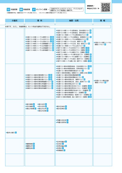 対対面授業映映像授業オオンライン授業ご自宅でタブレットやスマートフォン、パソコンなどで受講する「ライブ配信型」授業です。*映像授業の申込・受講方法は17ページをご覧ください。*オンライン授業の詳細は20ページをご覧ください。講座案内・申込はこちら!▶小論文理科地歴・公民情報お得です。ただし、対面授業は、セット料金の適用はできません。●共通テスト本番リハーサル物理テスト対映●共通テスト本番リハーサル化学テスト対映●共通テスト本番リハーサル生物テスト対映●共通テスト本番リハーサル物理基礎テスト映●共通テスト本番リハーサル化学基礎テスト映●共通テスト本番リハーサル生物基礎テスト映●共通テスト本番リハーサル地学基礎テスト映●共通テスト傾向対策物理テスト対映●共通テスト傾向対策化学テスト対映●共通テスト傾向対策生物テスト対映●共通テスト傾向対策物理基礎テスト映●共通テスト傾向対策化学基礎テスト映●共通テスト傾向対策生物基礎テスト映●共通テスト傾向対策地学基礎テスト映●共通テスト本番リハーサル歴史総合,日本史探究テスト映●共通テスト本番リハーサル歴史総合,世界史探究テスト映●共通テスト本番リハーサル歴史総合テスト映●共通テスト本番リハーサル地理総合,地理探究テスト映●共通テスト本番リハーサル地理総合テスト映●共通テスト本番リハーサル公共,倫理テスト映●共通テスト本番リハーサル公共,政治・経済テスト映●共通テスト本番リハーサル公共テスト映●共通テスト本番リハーサル日本史Bテスト(旧課程)対映●共通テスト本番リハーサル世界史Bテスト(旧課程)対映●共通テスト本番リハーサル地理Bテスト(旧課程)対映●共通テスト本番リハーサル現代社会テスト(旧課程)映●共通テスト本番リハーサル倫理テスト(旧課程)映●共通テスト本番リハーサル政治・経済テスト(旧課程)映●共通テスト本番リハーサル倫理,政治・経済テスト(旧課程)対映●共通テスト傾向対策歴史総合,日本史探究テスト対映●共通テスト傾向対策歴史総合,世界史探究テスト映●共通テスト傾向対策歴史総合テスト映●共通テスト傾向対策地理総合,地理探究テスト(旧課程にも対応)対映●共通テスト傾向対策地理総整理映●共通テスト傾向対策地理総合テスト映●共通テスト傾向対策公共,倫理テスト映●共通テスト傾向対策公共,政治・経済テスト映●共通テスト傾向対策公共テスト映●共通テスト傾向対策日本史Bテスト(旧課程)対映●共通テスト傾向対策世界史Bテスト(旧課程)対映●共通テスト傾向対策現代社会テスト(旧課程)映●共通テスト傾向対策倫理テスト(旧課程)映●共通テスト傾向対策政治・経済テスト(旧課程)映●共通テスト傾向対策倫理,政治・経済テスト(旧課程)対映●共通テスト本番リハーサル情報Ⅰテスト映●共通テスト傾向対策情報Ⅰテスト映※1●東大物理対●京大物理対●東北大物理対●東大化学対●京大化学対●東北大化学対●東北大生物対●東大日本史対●東大世界史対●医系小論文対●難関物理対●難関化学対●難関生物対●早慶大日本史オ●早慶大世界史オ●日本史論述対●日本史オ●世界史論述対●世界史オ●地理論述対