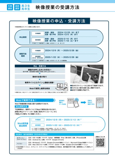 冬期講習直前講習高3生高卒生映像授業の受講方法映像授業の申込・受講方法*映像授業はオンライン授業とは異なります。申込期間視聴可能期間冬期講習直前講習新規・追加2024/12/25(水)まで変更・取りやめ2024/12/5(木)まで新規・追加2025/2/10(月)まで変更・取りやめ2025/1/18(土)※まで※「共通テスト本番突破テスト講座」は2025/1/1(水・祝)まで冬期講習2024/12/9(月)〜2025/2/28(金)直前講習(高3生・高卒生対象)2025/1/22(水)〜2025/2/28(金)※「共通テスト本番突破テスト講座」は2025/1/6(月)から視聴開始申込・受講方法講座のお申し込みとお支払い他の冬期・直前講習の講座と同様にお申し込みください。教材のお受け取り専用サイトにログインし講義を視聴※Webで質問し疑問を解消●自分のスケジュールにあわせて受講できます。●わからない部分は繰り返し視聴できます。●自宅での視聴も可能です。※視聴方法は、申込マイページの「各種ご案内ダウンロード」から「受講上のご案内」などをご確認ください。Webで質問できる!Webで映像授業の内容に関する質問ができます。Web質問方法下記期間内に、専用サイトにてWebで質問を受け付けます。詳細は申込マイページの「各種ご案内ダウンロード」から「受講上のご案内」をご確認ください。質問書を撮影しデータ送信カシャ!回答がWebで確認できるWeb質問書提出期間冬期講習直前講習2024/12/9(月)〜2025/2/13(木)※12025/1/22(水)〜2025/2/13(木)※2※1「共通テスト対策講座」に関する質問は、1/6(月)12:00まで。※2「共通テスト本番突破テスト講座」に関する質問の受付は行いません。対応端末・動作推奨環境(2024年8月現在)タブレット/スマートフォン【OS:iOS14以降】ブラウザ:Safari推奨機種:iPad(第4世代)以降、iPhone5s以降【OS:Android9.x以降】ブラウザ:GoogleChromeパソコン【OS:Windows】ブラウザ:GoogleChromeの最新バージョン、MicrosoftEdgeの最新バージョン【OS:MacOSⅩ10.11以降】ブラウザ:Safari11以降、GoogleChromeの最新バージョン※OSの将来バージョン、タブレット/スマートフォンの新機種などの対応は、動作確認が完了次第、推奨環境としてご案内していきます。詳細はこちら▼
