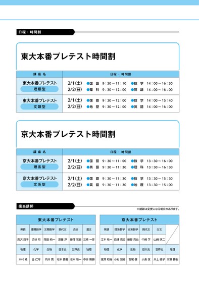 日程・時間割東大本番プレテスト時間割講座名東大本番プレテスト理類型東大本番プレテスト文類型日程・時間割2/1(土)●国語2/2(日)●理科2/1(土)●国語2/2(日)●地歴9:30〜11:109:30〜12:00●数学●英語14:00〜16:3014:00〜16:009:30〜12:009:30〜12:00●数学●英語14:00〜15:4014:00〜16:00京大本番プレテスト時間割講座名日程・時間割京大本番プレテスト理系型2/1(土)●国語2/2(日)●英語9:30〜11:009:30〜11:30●数学●理科13:30〜16:0013:30〜16:30京大本番プレテスト文系型2/1(土)●国語2/2(日)●英語9:30〜11:309:30〜11:30●数学●地歴13:30〜15:3013:30〜15:00担当講師※講師は変更になる場合があります。東大本番プレテスト京大本番プレテスト英語理類数学文類数学現代文古文漢文英語理系数学文系数学現代文古文高沢節子渋谷司岡田純一斎藤淳藤澤咲良三森一彦江本祐一西浦高志藤野真也中崎学山崎瑛二物理化学生物日本史世界史地理物理化学生物日本史世界史地理木村純金仁守向井亮坂本勝義坂本新一中井隆顕瀧澤和樹小松知修西尾健小倉匡井上徳子河野貴樹
