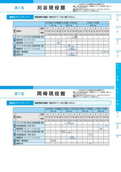 名駅千種星ヶ丘岐阜浜松豊橋刈谷岡崎豊田四日市津高1生刈谷現役館この色のマスが授業のある時限です。●同一名称の講座は設置校舎・設置期間(ターム)・授業時間(時限)が異なっても同一内容です。●担当講師は変更になる場合がありますので、あらかじめご了承ください。●講師のフルネームはWebサイトでご確認ください。豊富なラインアップ!映像授業の講座一覧は59ページをご覧ください。12/16(月)~12/20(金)12/22(日)~12/24(火)1ターム2ターム456456121/2(木)~1/6(月)4ターム345616:2018:1020:0016:2018:1020:0010:0011:5014:3016:2018:1020:00〜〜〜〜17:5019:4021:3017:50〜〜〜〜〜〜11:3013:2016:0017:5019:4021:30〜〜19:4021:30渡部12/21・22の2日間山本岩崎加藤12/21・22の2日間吉嗣12/24は5限のみ田島12/24は5限のみ井上(真)・横井講座名時限時間【ダイジェスト】冬から始める入試対策英語(難関・標準)難関英語(トップレベル)難関英語(ハイレベル)【ダイジェスト】冬から始める入試対策数学(難関・標準)難関数学(トップ・ハイレベル)難関・標準国語難関化学教科英語数学国語理科高1生岡崎現役館この色のマスが授業のある時限です。●同一名称の講座は設置校舎・設置期間(ターム)・授業時間(時限)が異なっても同一内容です。●担当講師は変更になる場合がありますので、あらかじめご了承ください。●講師のフルネームはWebサイトでご確認ください。12/16(月)~12/20(金)12/22(日)~12/24(火)12/25(水)~12/29(日)1/2(木)~1/6(月)1ターム2ターム3ターム4ターム45645645645616:2018:1020:0016:2018:1020:0016:2018:1020:0016:2018:1020:00〜〜〜〜〜〜〜〜〜〜〜〜17:5019:4021:3017:5019:4021:3017:5019:4021:3017:5019:4021:30市位12/21・22の2日間山田(龍)12/21・22の2日間山田(龍)12/22は6限のみ平野・伊藤伊藤永瀬竹内若原講座名時限時間【ダイジェスト】冬から始める入試対策英語(難関・標準)特別選抜英語(ONEWEX)難関英語(トップ・ハイレベル)【ダイジェスト】冬から始める入試対策数学(難関・標準)特別選抜数学(ONEWEX)難関数学(トップ・ハイレベル)難関・標準国語難関化学教科英語数学国語理科豊富なラインアップ!映像授業の講座一覧は59ページをご覧ください。●2024年度/冬期講習/中部/刈谷/高1生/パターン12452024_57_4_448_31_20240717172726.csv/1ページ校了時削除