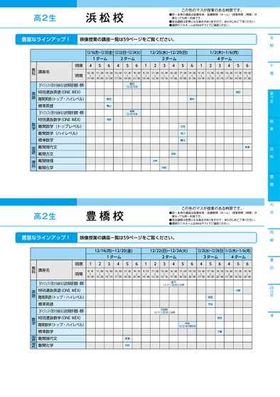 高2生浜松校この色のマスが授業のある時限です。●同一名称の講座は設置校舎・設置期間(ターム)・授業時間(時限)が異なっても同一内容です。●担当講師は変更になる場合がありますので、あらかじめご了承ください。●講師のフルネームはWebサイトでご確認ください。名駅千種星ヶ丘岐阜浜松豊橋刈谷岡崎豊田四日市津12/16(月)~12/20(金)12/22(日)~12/24(火)12/25(水)~12/29(日)1/2(木)~1/6(月)1ターム2ターム456456123ターム3456124ターム345615:30〜17:0017:30〜19:0019:30〜21:0015:30〜17:0017:30〜19:0019:30〜21:009:10〜10:4011:00〜12:3013:40〜15:1015:30〜17:0017:30〜19:0019:30〜21:009:10〜10:4011:00〜12:3013:40〜15:1015:30〜17:0017:30〜19:0019:30〜21:00時限時間講座名原田12/22のみ市野12/23のみ原田亀山河原【ダイジェスト】冬から始める入試対策英語(難関・標準)特別選抜英語(ONEWEX)難関英語(トップ・ハイレベル)標準英語【ダイジェスト】冬から始める入試対策数学(難関・標準)特別選抜数学(ONEWEX)難関数学(トップレベル)難関数学(ハイレベル)標準数学難関現代文難関古文難関物理難関化学青木室田小田谷口鷲山河合小林中村安達教科英語数学国語理科豊富なラインアップ!映像授業の講座一覧は59ページをご覧ください。高2生豊橋校この色のマスが授業のある時限です。●同一名称の講座は設置校舎・設置期間(ターム)・授業時間(時限)が異なっても同一内容です。●担当講師は変更になる場合がありますので、あらかじめご了承ください。●講師のフルネームはWebサイトでご確認ください。12/16(月)~12/20(金)12/22(日)~12/24(火)12/25(水)~12/29(日)1/2(木)~1/6(月)1ターム34122ターム3ターム4ターム561234564564569:10〜10:4011:00〜12:3013:40〜15:1015:30〜17:0017:20〜18:5019:10〜20:409:10〜10:4011:00〜12:3013:40〜15:1015:30〜17:0017:20〜18:5019:10〜20:4015:30〜17:0017:20〜18:5019:10〜20:4015:30〜17:0017:20〜18:5019:10〜20:40時限時間講座名【ダイジェスト】冬から始める入試対策英語(難関・標準)特別選抜英語(ONEWEX)難関英語(トップ・ハイレベル)標準英語【ダイジェスト】冬から始める入試対策数学(難関・標準)特別選抜数学(ONEWEX)難関数学(トップ・ハイレベル)標準数学難関現代文難関化学安達中村宮下12/21・22の2日間川野三田村12/21・22の2日間河合12/22は6限のみ原田市位宮田三輪教科英語数学国語理科豊富なラインアップ!映像授業の講座一覧は59ページをご覧ください。●2024年度/冬期講習/中部/浜松/高2生/パターン13452024_57_4_433_32_20240717103940.csv/1ページ校了時削除
