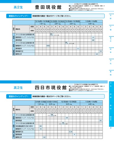 高2生豊田現役館この色のマスが授業のある時限です。●同一名称の講座は設置校舎・設置期間(ターム)・授業時間(時限)が異なっても同一内容です。●担当講師は変更になる場合がありますので、あらかじめご了承ください。●講師のフルネームはWebサイトでご確認ください。名駅千種星ヶ丘岐阜浜松豊橋刈谷岡崎豊田四日市津12/16(月)~12/20(金)12/22(日)~12/24(火)/22()〜12/24(火)12/25(水)~12/29(日)1/2(木)~1/6(月)1ターム2ターム3ターム345634563456124ターム345614:30〜16:0016:20〜17:5018:10〜19:4020:00〜21:3014:30〜16:0016:20〜17:5018:10〜19:4020:00〜21:3014:30〜16:0016:20〜17:5018:10〜19:4020:00〜21:3010:00〜11:3011:50〜13:2014:30〜16:0016:20〜17:5018:10〜19:4020:00〜21:30時限時間講座名【ダイジェスト】冬から始める入試対策英語(難関・標準)難関英語(トップ・ハイレベル)標準英語【ダイジェスト】冬から始める入試対策数学(難関・標準)難関数学(トップ・ハイレベル)標準数学標準現代文難関化学渡部12/21・22の2日間村瀬(竜)加藤12/28・29の2日間山上山本桑野平野若原教科英語数学国語理科豊富なラインアップ!映像授業の講座一覧は59ページをご覧ください。高2生四日市現役館この色のマスが授業のある時限です。●同一名称の講座は設置校舎・設置期間(ターム)・授業時間(時限)が異なっても同一内容です。●担当講師は変更になる場合がありますので、あらかじめご了承ください。●講師のフルネームはWebサイトでご確認ください。12/16(月)~12/20(金)12/22(日)~12/24(火)12/25(水)~12/29(日)1/2(木)~1/6(月)1ターム2ターム456456123ターム3456124ターム345615:40〜17:1017:30〜19:0019:20〜20:5015:40〜17:1017:30〜19:0019:20〜20:509:30〜11:0011:20〜12:5013:50〜15:2015:40〜17:1017:30〜19:0019:20〜20:509:30〜11:0011:20〜12:5013:50〜15:2015:40〜17:1017:30〜19:0019:20〜20:50時限時間講座名伊藤12/21・22の2日間長瀬西畑12/28・29の2日間【ダイジェスト】冬から始める入試対策英語(難関・標準)難関英語(トップ・ハイレベル)標準英語【ダイジェスト】冬から始める入試対策数学(難関・標準)特別選抜数学(ONEWEX)難関数学(トップ・ハイレベル)難関現代文難関物理難関化学西畑三輪花田井上(真)岸落合教科英語数学国語理科豊富なラインアップ!映像授業の講座一覧は59ページをご覧ください。●2024年度/冬期講習/中部/豊田/高2生/パターン13452024_57_4_449_32_20240717103940.csv/1ページ校了時削除