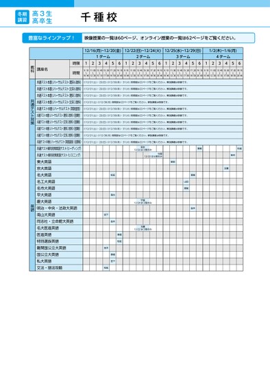 12/16(月)~12/20(金)12/22(日)~12/24(火)12/25(水)~12/29(日)1/2(木)~1/6(月)1ターム2ターム3ターム4ターム1234561234561234561234569:10〜10:4011:00〜12:3013:40〜15:1015:30〜17:0017:20〜18:5019:10〜20:409:10〜10:4011:00〜12:3013:40〜15:1015:30〜17:0017:20〜18:5019:10〜20:409:10〜10:4011:00〜12:3013:40〜15:1015:30〜17:0017:20〜18:5019:10〜20:409:10〜10:4011:00〜12:3013:40〜15:1015:30〜17:0017:20〜18:5019:10〜20:40①12/21(土)・22(日)②12/30(月)・31(火)時間割は22ページをご覧ください。解説講義は映像です。土)・22()②1/0(月)・3火時ージをご覧ください。解説講義は映像です。①12/21(土)・22(日)②12/30(月)・31(火)時間割は●ページをご覧ください。解説講義は映像です。土)・22日)②230(月)・()2ページをご覧ください。解説講義は映像です。①12/21(土)・22(日)②12/30(月)・31(火)時間割は●ページをご覧ください。解説講義は映像です。①12/21(土)・22(日)②12/30(月)・31(火)時間割は22ページをご覧ください。解説講義は映像です。①12/21(土)②12/30(月)時間割は●ページをご覧ください。解説講義は映像です。土)②12/30月時間割は22ページをくださ解説講映像で。①12/21(土)・22(日)②12/30(月)・31(火)時間割は●ページをご覧ください。解説講義は映像です。土)・22日)②230(月)・()2ページをご覧ください。解説講義は映像です。①12/21(土)・22(日)②12/30(月)・31(火)時間割は●ページをご覧ください。解説講義は映像です。土)・22日)②230(月)・()2ページをご覧ください。解説講義は映像です。①12/21(土)・22(日)②12/30(月)・31(火)時間割は●ページをご覧ください。解説講義は映像です。土)・22日)②230(月)・()2ページをご覧ください。解説講義は映像です。①12/21(土)・22(日)②12/30(月)・31(火)時間割は●ページをご覧ください。解説講義は映像です。①12/21(土)・22(日)②12/30(月)・31(火)時間割は22ページをご覧ください。解説講義は映像です。①12/21(土)②12/30(月)時間割は●ページをご覧ください。解説講義は映像です。土)②12/30月時間割は22ページをくださ解説講映像で。①12/21(土)・22(日)②12/30(月)・31(火)時間割は●ページをご覧ください。解説講義は映像です。土)・22日)②230(月)・()2ページをご覧ください。解説講義は映像です。宮本12/24は3限のみ守屋12/22は6限のみ室田塚越松延笹村玉置塚越山田塚越金井守屋12/24は3限のみ玉置12/22は3限のみ松延落合塚越松延宮下金井金井松延塚越宮下時限時間講座名教科共通テスト本番リハーサルテスト(理系6教科)共通テスト本番リハーサルテスト(文系6教科)共通テスト本番リハーサルテスト(理系3教科)共通テスト本番リハーサルテスト(文系3教科)共通テスト本番リハーサルテスト(英数国型)共通テスト本番リハーサルテスト(理系5教科)旧課程)共通テスト本番リハーサルテスト(文系5教科)旧課程)共通テスト本番リハーサルテスト(理系3教科)旧課程)共通テスト本番リハーサルテスト(文系3教科)旧課程)共通テスト本番リハーサルテスト(英数国型)旧課程)共通テスト傾向対策英語テスト(リーディング)共通テスト傾向対策英語テスト(リスニング)東大英語京大英語名大英語名工大英語名市大英語早大英語慶大英語明治・中央・法政大英語南山大英語同志社・立命館大英語名大医進英語医進英語特別選抜英語難関国公立大英語国公立大英語私大英語文法・語法攻略共通テスト対策英語冬期講習高3生高卒生千種校豊富なラインアップ!映像授業の一覧は60ページ、オンライン授業の一覧は62ページをご覧ください。●2024年度/冬期講習/中部/千種/高3・卒生/パターン14452024_57_4_413_11_20240717113649.csv/1ページ校了時削除