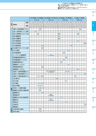 この色のマスが授業のある時限です。●同一名称の講座は設置校舎・設置期間(ターム)・授業時間(時限)が異なっても同一内容です。●担当講師は変更になる場合がありますので、あらかじめご了承ください。●講師のフルネームはWebサイトでご確認ください。名駅千種星ヶ丘岐阜浜松豊橋刈谷岡崎豊田四日市津12/16(月)~12/20(金)12/22(日)~12/24(火)12/25(水)~12/29(日)1/2(木)~1/6(月)1ターム2ターム3ターム4ターム1234561234561234561234569:10〜10:4011:00〜12:3013:40〜15:1015:30〜17:0017:20〜18:5019:10〜20:409:10〜10:4011:00〜12:3013:40〜15:1015:30〜17:0017:20〜18:5019:10〜20:409:10〜10:4011:00〜12:3013:40〜15:1015:30〜17:0017:20〜18:5019:10〜20:409:10〜10:4011:00〜12:3013:40〜15:1015:30〜17:0017:20〜18:5019:10〜20:40時限時間講座名教科森本(将)西畑高田村瀬(宗)森本(将)野村福眞三田村高田水嶋笠岡水嶋森本(将)大庭小田12/22は3限のみ佐藤・井上(摩)・鈴木(孝)12/24は3限のみ安達・鈴木(一)・江森本(将)高橋笹森・江高橋坂下・江高橋12/24は3限のみ坂下12/24は3限のみ坂下江井上(摩)山村市野小倉小倉市野宮田小栗井上(摩)・鈴木(孝)武下・井上(摩)日嵩・井上(摩)齊藤・大田福永福永高尾大田共通テスト傾向対策数学ⅠAテスト共通テスト傾向対策数学ⅠAテスト(旧課程)共通テスト傾向対策数学テスト(ⅡB+ベクトル型)東大理類数学東大文類数学京大理系数学京大文系数学名大理系数学名大数学(ⅡB+ベクトル型)名工大数学名大医進数学トップレベル医進数学特別選抜理系数学ⅢC特別選抜数学ⅠAⅡBC難関理系数学ⅢC難関数学ⅠAⅡBC標準理系数学ⅢC標準数学ⅠAⅡBC共通テスト傾向対策国語テスト共通テスト傾向対策現代文テスト共通テスト傾向対策古典テスト名大現代文名大古典早大国語南山大国語同志社・立命館大国語難関国公立大現代文(論述対策)難関現代文標準現代文難関国公立大古文(論述対策)難関古文標準古文古典文法難関漢文社会科学系小論文医系小論文数学国語小論文●2024年度/冬期講習/中部/千種/高3・卒生/パターン14452024_57_4_413_11_20240717113649.csv/2ページ校了時削除