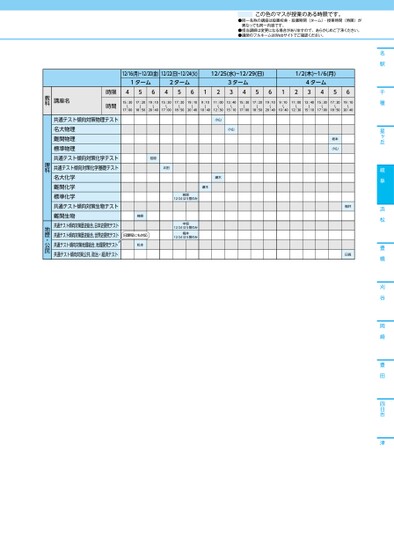 この色のマスが授業のある時限です。●同一名称の講座は設置校舎・設置期間(ターム)・授業時間(時限)が異なっても同一内容です。●担当講師は変更になる場合がありますので、あらかじめご了承ください。●講師のフルネームはWebサイトでご確認ください。名駅千種星ヶ丘岐阜浜松豊橋刈谷岡崎豊田四日市津12/16(月)~12/20(金)12/22(日)~12/24(火)12/25(水)~12/29(日)1/2(木)~1/6(月)1ターム2ターム456456123ターム3456124ターム345615:30〜17:0017:20〜18:5019:10〜20:4015:30〜17:0017:20〜18:5019:10〜20:409:10〜10:4011:00〜12:3013:40〜15:1015:30〜17:0017:20〜18:5019:10〜20:409:10〜10:4011:00〜12:3013:40〜15:1015:30〜17:0017:20〜18:5019:10〜20:40時限時間講座名教科坂本小山福井日髙小山小山若原太田瀬木瀬木若原12/24は5限のみ中垣12/24は5限のみ堀井12/24は5限のみ榊原旧課程にも対応松本共通テスト傾向対策物理テスト名大物理難関物理標準物理共通テスト傾向対策化学テスト共通テスト傾向対策化学基礎テスト名大化学難関化学標準化学共通テスト傾向対策生物テスト難関生物共通テスト傾向対策歴史総合,日本史探究テスト共通テスト傾向対策歴史総合,世界史探究テスト共通テスト傾向対策地理総合,地理探究テスト共通テスト傾向対策公共,政治・経済テスト理科地歴・公民●2024年度/冬期講習/中部/岐阜/高3・卒生/パターン13452024_57_4_412_11_20240717184250.csv/2ページ校了時削除