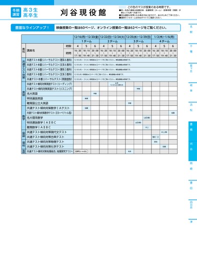 名駅千種星ヶ丘岐阜浜松豊橋刈谷岡崎豊田四日市津冬期講習高3生高卒生刈谷現役館この色のマスが授業のある時限です。●同一名称の講座は設置校舎・設置期間(ターム)・授業時間(時限)が異なっても同一内容です。●担当講師は変更になる場合がありますので、あらかじめご了承ください。●講師のフルネームはWebサイトでご確認ください。豊富なラインアップ!映像授業の一覧は60ページ、オンライン授業の一覧は62ページをご覧ください。12/16(月)~12/20(金)12/22(日)~12/24(火)12/25(水)~12/29(日)1/2(木)~1/6(月)1ターム2ターム3ターム4ターム45645645645616:2018:1020:0016:2018:1020:0016:2018:1020:0016:2018:1020:00〜〜〜〜〜〜〜〜〜〜〜〜17:5019:4021:3017:5019:4021:3017:5019:4021:3017:5019:4021:3012/30(月)・31(火)時間割は22ページをご覧ください。解説講義は映像です。)・31()時間割は●ペジをご覧ださい。説講義は像です。12/30(月)・31(火)時間割は●ページをご覧ください。解説講義は映像です。)・31火)時間割は22ージをごください解説講義映像です。12/30(月)・31(火)時間割は●ページをご覧ください。解説講義は映像です。12/30(月)・31(火)時間割は22ページをご覧ください。解説講義は映像です。12/30(月)時間割は●ページをご覧ください。解説講義は映像です。)時間割は2ページをご覧ください。解説講義は映像です。12/30(月)・31(火)時間割は●ページをご覧ください。解説講義は映像です。)・31火)時間割は22ージをごください解説講義映像です。山本12/22は6限のみ宇野宇野岩崎加藤宇野山田(龍)山田(龍)大上加藤横井・江宮地井上(真)田島旧課程にも対応松本講座名時限時間共通テスト本番リハーサルテスト(理系6教科)共通テスト本番リハーサルテスト(文系6教科)共通テスト本番リハーサルテスト(理系3教科)共通テスト本番リハーサルテスト(文系3教科)共通テスト本番リハーサルテスト(英数国型)共通テスト傾向対策英語テスト(リーディング)共通テスト傾向対策英語テスト(リスニング)名大英語特別選抜英語難関国公立大英語共通テスト傾向対策数学ⅠAテスト共通テスト傾向対策数学テスト(ⅡB+ベクトル型)名大理系数学特別選抜数学ⅠAⅡBC難関数学ⅠAⅡBC共通テスト傾向対策現代文テスト共通テスト傾向対策古典テスト共通テスト傾向対策物理テスト共通テスト傾向対策化学テスト共通テスト傾向対策地理総合,地理探究テスト教科共通テスト対策英語数学国語理科地歴●2024年度/冬期講習/中部/刈谷/高3・卒生/パターン12452024_57_4_448_11_20240717114002.csv/1ページ校了時削除