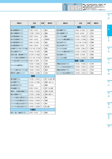 講座名日程時限5・63・4講師名地歴・公民ファイナル私大日本史テスト1/27(月)・1/28(火)早慶大日本史テストファイナル数学ⅢC21/25(土)・1/26(日)25・6中垣5・6中垣早慶大世界史テスト1/25(土)・1/26(日)ァイナル学ⅡBベクトル型)31・2平松●2024年度/直前講習/中部/千種/高3・卒生/パターン7043/2024_59_4_413_11_20240711154337.csvファイナル私大世界史テスト1/27(月)・1/28(火)学ⅢC必勝チェック25・6校了時削除堀井講座名日程時限3・45・6講師名共通テスト対策共通テスト本番突破英語テスト(リーディング)大文類学テト1/9(木)・2/4(火)(土)・2/6日):2020:30岩崎1/12(日)月・1/28(火)11(・)・2/12(水)112:20登木1/13(月・祝)月)・2/4(火)土・26日)12:30〜15:40松延共通テスト本番突破英語テスト(リスニング)大理数学スト1/11(土)月)・2/4(火)/630〜18:00宮下1/12(日)日)・2/10(月)・1/6(日):2〜14:50笹村1/13(月・祝)水)・2/6(木)三田村10:00〜11:30市位共通テスト本番突破数学ⅠAテスト名工大数学テスト語テスト名大数学テスト(ⅡB+ベクトル型)2/11(火・祝)・2/12(水)イナル国立大英テスト10金))・26(72020:00西畑1/14(火)土・2/16(日)16:0〜20:40森本共通テスト本番突破数学ⅡBCテスト名市大(医・薬)数学テストファイナル国公立大理系数学テスト解完全攻由英文徹指導1/7(火)(木)・2/14(金)・2/2日:0020:40森本1/12(日)11(・祝)・2/12(水)/8土1017:50笠岡共通テスト本番突破国語テストファイナル国公立大数学テスト(ⅡB+ベクトル型)2/9(日)・2/10(月)作文完全攻略スト(日)水・1/0(木):1〜20:50福永・井上(摩)・江1/13(月・祝)7)・1/28(火))09:10〜15:40佐藤・坂下・野村共通テスト本番突破物理テストファイナル数学(ⅡB+ベクトル型)1/29(水)・1/30(木)1/12(日)木・1/24(金))0:3〜12:00坂本火1:3〜20:00西浦共通テスト本番突破化学テスト数学ⅢC必勝チェック1/8(水)(木)・1/24(金)18:1020:40大宮1/11(土)10:20〜12:50青野共通テスト本番突破化学基礎テスト大国テス1/8(水)(月)・1/28(火)1:3019:00大宮共通テスト本番突破生物テスト大国語テス1/14(火)木・2/14(金)1:3〜20:00福井共通テスト本番突破生物基礎テスト大現文テト1/8(水)(木)19:20〜20:50福井共通テスト本番突破歴史総合,日本史探究テスト大国語テスト1/11(土)月)・2/4(火)1340〜16:10酒井共通テスト本番突破歴史総合,世界史探究テスト志社立命館大語スト1/25(土)・1/26(日)日1:3〜15:00平松共通テスト本番突破地理総合,地理探究テスト山大語テスト1/13(月・祝)・124(金)16:00〜18:30小池共通テスト本番突破公共,政治・経済テストァイナル国公大現代文テスト1/9(木)(土)・2/16(日)17:2019:50日髙英語東大英語テストァイナル国公大古文テスト2/3(月)・2/4(火)(土)・2/6日)3・4室田京大英語テスト古文テスト2/3(月)・2/4(火)(木)・1/4金)5・6登木(摩)北大英語テスト2/11(火・祝)・2/12(水)3・4松延名大英語テスト名大(法)小論文テスト1/29(水)・1/30(木)月)・2/4火5・6松延2/11(火・祝)・2/12(水)5・6塚越名工大英語テスト2/15(土)・2/16(日)日)・2/1(月)3・4笹村名市大英語テスト2/11(火・祝)・2/12(水)5()・2/6()3・4塚越愛県大英語テスト2/15(土)・2/16(日)土161・2落合早大英語テスト物理テスト2/3(月)・2/4(火)(木)・2/4金)3・4登木南山大英語テスト1/25(土)・1/26(日)11(・)2/(水)1・2金井同志社・立命館大英語テスト1/25(土)・1/26(日)大化学テスト1・2宮下ファイナル国公立大英語テストァイナル化2/5(水)・2/6(木)(月)・1/8火)3・4松延ファイナル私大英語テスト1/25(土)・1/26(日)土263・4金井英文読解完全攻略2/1(土)・2/2(日)/(月)5・6玉置自由英作文徹底指導1/30(木)・2/8(土)土26(日)5・6遠藤英作文完全攻略テスト1/29(水)・1/30(木)3・4松延講座名日程小論文時限3・4講師名数学東大理類数学テスト2/3(月)・2/4(火)(月)5・6野村東大文類数学テスト1/27(月)・1/28(火)水)・26木3・4福眞京大理系数学テスト2/3(月)・2/4(火)(土)・/6日)3・4高田京大文系数学テストテスト2/3(月)・2/4(火)(木)・/4金)3・4村瀬(宗)北大理系数学テスト2/9(日)・2/10(月)11火・祝)・2/12(水)3・4高田名大理系数学テスト2/5(水)・2/6(木)2(5・6三田村名大数学テスト(ⅡB+ベクトル型)2/11(火・祝)・2/12(水)ァイナ学27月)・1/28火)3・4宮田名工大数学テスト学テスト2/15(土)・2/16(日)1・2福眞名市大(医・薬)数学テスト物テスト2/13(木)・2/14(金)日)・21月)水嶋ファイナル国公立大理系数学テストァイル生物2/11(火・祝)・2/12(水)15土)・2/16日)森本ファイナル国公立大数学テスト(ⅡB+ベクトル型)2/9(日)・2/10(月)5・6小倉国語東大国語テスト1/27(月)・1/28(火)5・6武下・井上(摩)・野村名大国語テスト2/13(木)・2/14(金)5・6高橋・山村・江名大現代文テスト2/13(木)5・6高橋早大国語テスト2/3(月)・2/4(火)5・6武下・井上(摩)同志社・立命館大国語テスト1/25(土)・1/26(日)3・4佐藤・井上(摩)南山大国語テスト1/23(木)・1/24(金)5・6日嵩・鈴木(一)ファイナル国公立大現代文テスト2/15(土)・2/16(日)5・6福永ファイナル私大現代文テスト1/25(土)・1/26(日)5・6佐藤ファイナル国公立大古文テスト2/15(土)・2/16(日)3・4坂下ファイナル私大古文テスト1/23(木)・1/24(金)5・6井上(摩)小論文名大(法)小論文テスト2/3(月)・2/4(火)3・4高尾理科名大物理テスト2/9(日)・2/10(月)3・4窪田名工大物理テスト2/5(水)・2/6(木)5・6荒木