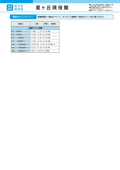 直前講習高3生高卒生星ヶ丘現役館●同一名称の講座は設置校舎・設置期間・授業時間(時限)が異なっても同一内容です。●講師のフルネームはWebサイトでご確認ください。●担当講師は変更になる場合がありますので、あらかじめご了承ください。豊富なラインアップ!映像授業の一覧は61ページ、オンライン授業の一覧は62ページをご覧ください。講座名日程時限講師名共通テスト対策共通テスト本番突破英語テスト(リーディング)1/10(金)17:20〜20:30村瀬共通テスト本番突破英語テスト(リスニング)1/12(日)19:00〜20:30松岡共通テスト本番突破数学ⅠAテスト1/12(日)13:00〜15:40水嶋共通テスト本番突破数学ⅡBCテスト1/12(日)16:00〜18:40水嶋共通テスト本番突破国語テスト1/13(月・祝)13:00〜18:40平野・江共通テスト本番突破物理テスト1/11(土)15:30〜18:00荒木共通テスト本番突破化学テスト1/8(水)18:00〜20:30青野