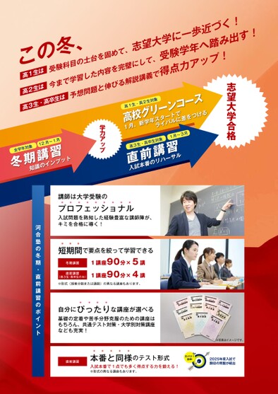 志望大学合格この冬、受験科目の土台を固めて、志望大学に一歩近づく!今まで学習した内容を完璧にして、受験学年へ踏み出す!予想問題と伸びる解説講義で得点力アップ!高1生は高2生は高3生・高卒生は生1高・象対生2高高校グリーンコースライバルに差をつける1月、新学年スタートで直前講習入試本番のリハーサル高卒高3〜・生3対生月1象月学力アップ月1〜月21象対年学全冬期講習知識のインプット講師は大学受験のプロフェッショナル入試問題を熟知した経験豊富な講師陣が、キミを合格に導く!短期間で要点を絞って学習できる冬期講習直前講習(高3生・高卒生のみ)1講座90分×5講1講座90分×4講※形式(授業分数または講数)の異なる講座もあります。自分にぴったりな講座が選べる基礎の定着や苦手分野克服のための講座はもちろん、共通テスト対策・大学別対策講座なども充実!直前講習本番と同様のテスト形式入試本番で1点でも多く得点する力を鍛える!※形式の異なる講座もあります。ズバリ!的中2025年度入試で類似の問題が続出※写真はイメージです。河合塾の冬期・直前講習のポイント