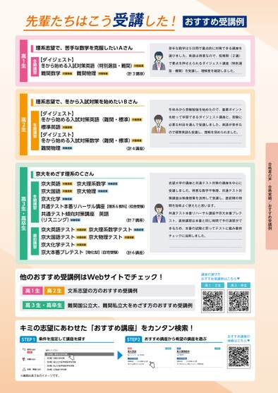 苦手な数学は5日間で重点的に対策できる講座を選びました。英語は得意なので、短期間(2講)で要点を押さえられるダイジェスト講座(特別選抜・難関)を受講し、理解度を確認しました。冬休みから受験勉強を始めたので、重要ポイントを絞って学習できるダイジェスト講座と、受験に必要な科目を選んで受講しました。英語が苦手なので標準英語も受講し、理解を深められました。合格者の声・合格実績/おすすめ受講例志望大学の講座と共通テスト対策の講座を中心に受講しました。得意な数学や物理、共通テスト対策講座は映像授業を活用して受講し、直前期の時間を効率よく使えたと思います。共通テスト本番リハーサル講座や京大本番プレテスト、直前講習は本番と同じ時間で予行演習ができるため、本番の試験と思ってテストに臨み最終チェックに活用しました。理系志望で、冬から入試対策を始めたいBさん【ダイジェスト】冬から始める入試対策英語(難関・標準)標準英語対面授業対面授業【ダイジェスト】冬から始める入試対策数学(難関・標準)難関物理映像授業計4講座対面授業映像授業対面授業対面授業京大英語京大理系数学京大国語京大物理京大化学共通テスト本番リハーサル講座【理系6教科】(校舎受験)共通テスト傾向対策講座英語映像授業映像授業(リスニング)映像授業対面授業京大英語テスト京大理系数学テスト京大国語テスト京大物理テスト京大化学テスト京大本番プレテスト【物化型】(自宅受験)対面授業対面授業対面授業計6講座計7講座映像授業冬期講習直前講習高3生・高卒生京大をめざす理系のCさん先輩たちはこう受講した!おすすめ受講例理系志望で、苦手な数学を克服したいAさん【ダイジェスト】冬から始める入試対策英語(特別選抜・難関)難関数学難関物理計3講座対面授業対面授業対面授業冬期講習冬期講習高1生高2生他のおすすめ受講例はWebサイトでチェック!高1生高2生文系志望の方のおすすめ受講例講座の選び方・おすすめ受講例はこちら▲高1・2生高3・卒生高3生・高卒生難関国公立大、難関私立大をめざす方のおすすめ受講例キミの志望にあわせた「おすすめ講座」をカンタン検索!STEP1条件を指定して講座を探すSTEP2おすすめ講座から希望の講座を選ぶおすすめ講座の検索はこちら▲【冬期】東京大学対策【冬期】京都大学対策【冬期】国公立大医学部医学科対策【冬期】私立大医学部医学科対策【冬期】北海道大学対策※画面は高3生のイメージです。東大英語東大理類数学