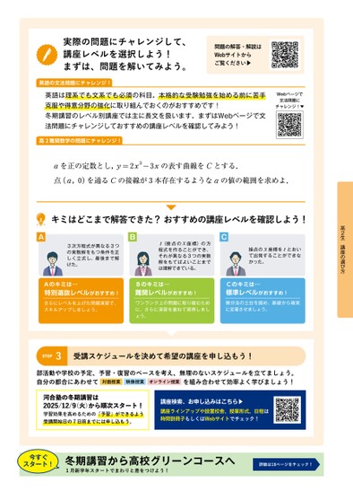 実際の問題にチャレンジして、講座レベルを選択しよう!まずは、問題を解いてみよう。問題の解答・解説はWebサイトからご覧ください▶英語の文法問題にチャレンジ!英語は理系でも文系でも必須の科目。本格的な受験勉強を始める前に苦手克服や得意分野の強化に取り組んでおくのがおすすめです!冬期講習のレベル別講座では主に長文を扱います。まずはWebページで文法問題にチャレンジしておすすめの講座レベルを確認してみよう!高2難関数学の問題にチャレンジ!Webページで文法問題にチャレンジ!▼高2生講座の選び方キミはどこまで解答できた?おすすめの講座レベルを確認しよう!AB3次方程式が異なる3つの実数解をもつ条件を正しく立式し、最後まで解けた。Ct(接点のx座標)の方程式を作ることができ、それが異なる3つの実数解をもてばよいことまでは理解できている。接点のx座標をtとおいて出発することができなかった。Aのキミは…特別選抜レベルがおすすめ!さらにレベルを上げた問題演習で、スキルアップしましょう。Bのキミは…難関レベルがおすすめ!ワンランク上の問題に取り組むために、さらに演習を重ねて習得しましょう。Cのキミは…標準レベルがおすすめ!微分法の土台を固め、基礎から確実に定着させましょう。STEP3受講スケジュールを決めて希望の講座を申し込もう!部活動や学校の予定、予習・復習のペースを考え、無理のないスケジュールを立てましょう。自分の都合にあわせてを組み合わせて効率よく学びましょう!オンライン授業対面授業映像授業河合塾の冬期講習は2025/12/9(火)から順次スタート!学習効果を高めるための「予習」ができるよう受講開始日の7日前までには申し込もう。講座検索、お申し込みはこちら▶講座ラインアップや設置校舎、授業形式、日程は時間割冊子もしくはWebサイトでチェック!今すぐスタート!冬期講習から高校グリーンコースへ1月新学年スタートでまわりと差をつけよう!詳細は18ページをチェック!