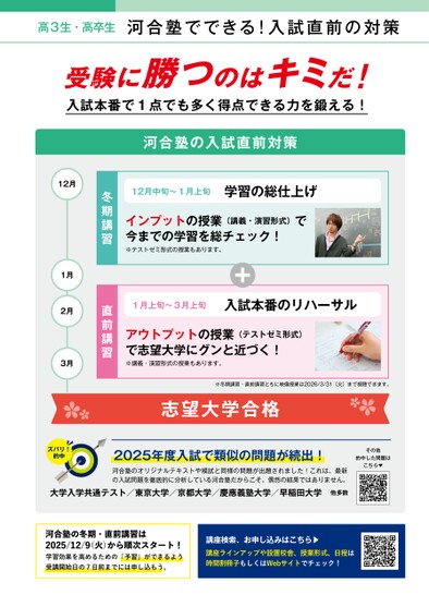 高3生・高卒生河合塾でできる!入試直前の対策受験に勝つのはキミだ!入試本番で1点でも多く得点できる力を鍛える!河合塾の入試直前対策12月中旬〜1月上旬学習の総仕上げインプットの授業(講義・演習形式)で今までの学習を総チェック!※テストゼミ形式の授業もあります。1月上旬〜3月上旬入試本番のリハーサルアウトプットの授業(テストゼミ形式)で志望大学にグンと近づく!※講義・演習形式の授業もあります。※冬期講習・直前講習ともに映像授業は2026/3/31(火)まで視聴できます。志望大学合格冬期講習直前講習12月1月2月3月ズバリ!的中2025年度入試で類似の問題が続出!河合塾のオリジナルテキストや模試と同様の問題が出題されました!これは、最新の入試問題を徹底的に分析している河合塾だからこそ。偶然の結果ではありません。大学入学共通テスト/東京大学/京都大学/慶應義塾大学/早稲田大学他多数河合塾の冬期・直前講習は2025/12/9(火)から順次スタート!学習効果を高めるための「予習」ができるよう受講開始日の7日前までには申し込もう。講座検索、お申し込みはこちら▶講座ラインアップや設置校舎、授業形式、日程は時間割冊子もしくはWebサイトでチェック!その他的中した問題はこちら▼