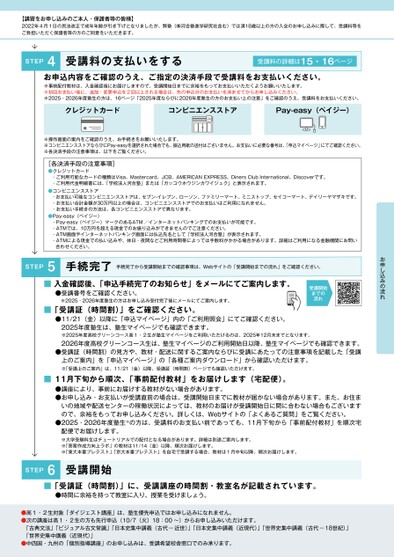 【講習をお申し込みのご本人・保護者等の皆様】2022年4月1日の民法改正で成年年齢が引き下げとなりましたが、弊塾(㈱河合塾進学研究社含む)では満18歳以上の方の入会のお申し込みに際して、受講料等をご負担いただく保護者等の方のご同意をいただきます。STEP4受講料の支払いをする受講料の詳細は15・16ページお申込内容をご確認のうえ、ご指定の決済手段で受講料をお支払いください。※事前配付教材は、入金確認後にお届けしますので、受講開始日までに余裕をもってお支払いいただくようお願いいたします。※初回お支払い後に、追加・変更申込を2回以上される場合は、先の申込分のお支払いを済ませてからお申し込みください。※2025・2026年度塾生の方は、16ページ「2025年度ならびに2026年度塾生の方のお支払い上の注意」をご確認のうえ、受講料をお支払いください。クレジットカードコンビニエンスストアPay-easy(ペイジー)※操作画面の案内をご確認のうえ、お手続きをお願いいたします。※コンビニエンスストアならびにPay-easyを選択された場合でも、振込用紙の送付はございません。お支払いに必要な番号は、「申込マイページ」にてご確認ください。※各決済手段の注意事項は、以下をご覧ください。[各決済手段の注意事項]●クレジットカード・ご利用可能なカードの種類はVisa、Mastercard、JCB、AMERICANEXPRESS、DinersClubInternational、Discoverです。・ご利用代金明細書には、「学校法人河合塾」または「ガッコウホウジンカワイジュク」と表示されます。●コンビニエンスストア●Pay-easy(ペイジー)・お支払い可能なコンビニエンスストアは、セブン-イレブン、ローソン、ファミリーマート、ミニストップ、セイコーマート、デイリーヤマザキです。・お支払い合計金額が30万円以上の場合は、コンビニエンスストアでのお支払いはご利用になれません。・お支払い手続きの方法は、各コンビニエンスストアで異なります。・Pay-easy(ベイジー)マークのあるATM/インターネットバンキングでのお支払いが可能です。・ATMでは、10万円を超える現金でのお振り込みができませんのでご注意ください。・ATM画面やインターネットバンキング画面には払込先名として「学校法人河合塾」が表示されます。・ATMによる現金での払い込みや、休日・夜間などご利用時間帯によっては手数料がかかる場合があります。詳細はご利用になる金融機関にお問い合わせください。お申し込みの流れ受講開始までの流れSTEP5手続完了手続完了から受講開始までの確認事項は、Webサイトの「受講開始までの流れ」をご確認ください。■入金確認後、「申込手続完了のお知らせ」をメールにてご案内します。●受講番号をご確認ください。※2025・2026年度塾生の方はお申し込み受付完了後にメールにてご案内します。■「受講証(時間割)」をご確認ください。●11/21(金)以降に「申込マイページ」内の「ご利用照会」にてご確認ください。2025年度塾生は、塾生マイページでも確認できます。※2025年度高校グリーンコース高1・2生が塾生マイページをご利用いただけるのは、2025年12月末までとなります。2026年度高校グリーンコース生は、塾生マイページのご利用開始日以降、塾生マイページでも確認できます。●受講証(時間割)の見方や、教材・配送に関するご案内ならびに受講にあたっての注意事項を記載した「受講上のご案内」を「申込マイページ」の「各種ご案内ダウンロード」から確認いただけます。※「受講上のご案内」は、11/21(金)以降、受講証(時間割)ページでも確認いただけます。■11月下旬から順次、「事前配付教材」をお届けします(宅配便)。●講座により、事前にお届けする教材がない場合があります。●お申し込み・お支払いが受講直前の場合は、受講開始日までに教材が届かない場合があります。また、お住まいの地域や配送センターの稼働状況によっては、教材のお届けが受講開始日に間に合わない場合もございますので、余裕をもってお申し込みください。詳しくは、Webサイトの「よくあるご質問」をご覧ください。●2025・2026年度塾生※の方は、受講料のお支払い前であっても、11月下旬から「事前配付教材」を順次宅配便でお届けします。※大学受験科生はチュートリアルでの配付となる場合があります。詳細は別途ご案内します。※「答案作成力向上ラボ」の教材は11/14(金)以降、順次お届けします。※「東大本番プレテスト」「京大本番プレテスト」を自宅で受講する場合、教材は1月中旬以降、順次お届けします。STEP6受講開始■「受講証(時間割)」に、受講講座の時間割・教室名が記載されています。●時間に余裕を持って教室に入り、授業を受けましょう。●高1・2生対象「ダイジェスト講座」は、塾生優先申込ではお申し込みになれません。●次の講座は高1・2生の方も先行申込(10/7(火)18:00〜)からお申し込みいただけます。「古典文法」「ビジュアル古文常識」「日本史集中講義(古代―近世)」「日本史集中講義(近現代)」「世界