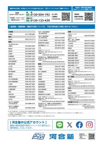講習の申込手続・お支払いについてのお問い合わせは、下記フリーダイヤルにご連絡ください。各校舎・教室の受付時間はWebサイトよりご確認ください。河合塾カスタマーサポートセンター受付時間12:00〜19:30※日祝および12/31〜1/3は受付を行いません。【関東】0120-50●4-19●2【関東以外】0120-12●3-43●9よくあるご質問はこちらから▶各校舎・教室の詳細はこちらから▶入塾相談・受講相談・講座の内容については、下記の各校舎にお問い合わせください。北海道札幌校東北仙台校関東〈東大専門特化校舎〉本郷校麹町校新宿校池袋校秋葉原館*自由が丘校吉祥寺現役館*調布現役館*立川校町田校厚木現役館*藤沢館*横浜校あざみ野現役館*金沢文庫現役館*大宮校南浦和現役館*川越現役館*柏校津田沼校千葉現役館*水戸校MEPLO池袋教室*(東大現役進学塾)MEPLO本郷教室(東大現役進学塾)(011)708-8581(022)215-5112(03)5803-0581(03)3230-1581(03)3362-6581(03)3988-0581(03)5825-1581(03)5726-3261(0422)23-6581(042)440-2581(042)526-0581(042)724-7581(046)227-6581(0466)50-2581(045)312-6581(045)905-2581(045)782-7581(048)647-0581(048)884-7581(049)229-1005(04)7168-2271(047)473-7581(043)241-3581(029)302-6581(03)3988-6731(03)5803-0584MEPLO表参道教室*(東大現役進学塾)MEPLO横浜教室*(東大現役進学塾)(03)5778-9480(045)316-6581www.kawai-juku.ac.jp/winɡs/kanto/www.kawai-juku.ac.jp/chukouikkan/(03)5331-7581(03)3367-2581(03)3830-1371(03)3813-4581COSMO東京校美術研究所新宿校海外帰国生コースK会中学グリーンコース校舎所在地・お問い合わせ先はWebサイトにてご確認ください。河合塾Winɡs(難関高校進学教室)*教室所在地・お問い合わせ先はWebサイトにてご確認ください。東海名駅校千種校星ヶ丘現役館*岐阜校浜松校豊橋校刈谷現役館*岡崎現役館*豊田現役館*四日市現役館*津現役館*美術研究所名古屋校小学・中学グリーンコース教室所在地・お問い合わせ先はWebサイトにてご確認ください。河合塾Winɡs(難関公立高校進学教室)*教室所在地・お問い合わせ先はWebサイトにてご確認ください。(052)451-0581(052)735-1588(052)782-0581(058)264-5581(053)453-5581(0532)54-0581(0566)21-3581(0564)54-3581(0565)32-5581(059)350-4581(059)226-0581(052)735-1596www.kawai-juku.ac.jp/jhɡreen/tokai/www.kawai-juku.ac.jp/winɡs/tokai/(06)6372-3592(06)6375-8581(06)6774-2581(06)6776-0581(075)252-0581(078)251-1715(06)6842-3581(072)686-6788(072)225-6072(072)436-8581(0742)30-0581(0744)29-3581(06)6372-5124近畿大阪北キャンパス大阪校大阪北キャンパス東大・京大・医進館(高卒生専用校舎)上本町校天王寺校京都校神戸三宮校現役生教室豊中*現役生教室高槻*現役生教室堺東*現役生教室岸和田*現役生教室西大寺*現役生教室八木*サポートコース梅田中学グリーンコース校舎所在地・お問い合わせ先はWebサイトにてご確認ください。中・四国広島校中学グリーンコース校舎所在地・お問い合わせ先はWebサイトにてご確認ください。www.kawai-juku.ac.jp/jhɡreen/hiroshima/九州福岡校北九州現役館*中学グリーンコース校舎所在地・お問い合わせ先はWebサイトにてご確認ください。河合塾マナビス校舎所在地はWebサイトにてご確認ください。(092)714-0581(093)330-6581www.kawai-juku.ac.jp/jhɡreen/fukuoka/www.kawai-juku.ac.jp/jhɡreen/kinki/(082)263-8581www.manavis.com/(03)3512-5771※(学)河合塾主催。*の校舎は(株)河合塾進学研究社主催の校舎です。河合塾マナビス各校舎の主催者は、各校舎へ直接お電話などでお問い合わせいただくか、河合塾マナビスのWebサイトでご確認ください。※「現役館」は登録商標です。※おかけ間違いにご注意ください。ⅠP電話など一部ご利用になれない場合があります。河合塾SNS公式アカウント一覧はこちらから▶