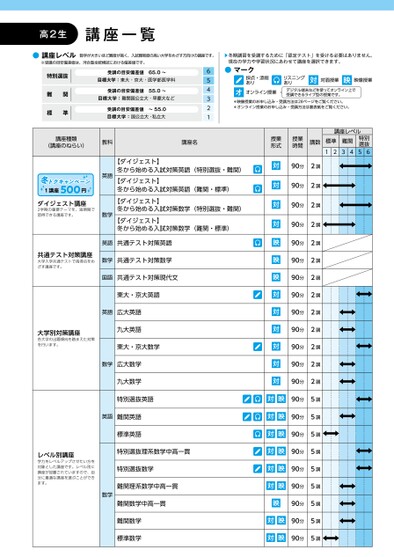 対対対対映映映対対対対対対90分2講90分2講90分2講90分2講90分2講90分2講90分2講90分2講90分2講90分2講90分2講90分2講90分2講対映90分5講対映90分5講対映90分5講対映90分5講対映90分5講対映90分5講映90分5講対映90分5講対映90分5講講座名授業形式授業時間講数講座レベル標準12難関34特別選抜56▶冬期講習を受講するために「認定テスト」を受ける必要はありません。現在の学力や学習状況にあわせて講座を選択できます。●マーク採点・添削ありリスニングあり対対面授業映映像授業オオンライン授業デジタル端末などを使ってオンライン上で受講できるライブ型の授業です。*映像授業のお申し込み・受講方法は28ページをご覧ください。*オンライン授業のお申し込み・受講方法は裏表紙をご覧ください。563412特別選抜難関標準受講の目安偏差値65.0〜目標大学:東大・京大・医学部医学科受講の目安偏差値55.0〜目標大学:難関国公立大・早慶大など受講の目安偏差値〜55.0目標大学:国公立大・私立大●講座レベル※受講の目安偏差値は、河合塾全統模試における偏差値です。数字が大きいほど難度が高く、入試難易度の高い大学をめざす方向けの講座です。高2生講座一覧講座種類(講座のねらい)冬トクキャンペーン1講座円500教科英語ダイジェスト講座2学期の重要テーマを、短期間で習得できる講座です。数学【ダイジェスト】冬から始める入試対策英語(特別選抜・難関)【ダイジェスト】冬から始める入試対策英語(難関・標準)【ダイジェスト】冬から始める入試対策数学(特別選抜・難関)【ダイジェスト】冬から始める入試対策数学(難関・標準)共通テスト対策講座大学入学共通テストで高得点をめざす講座です。大学別対策講座各大学の出題傾向を踏まえた対策を行います。英語共通テスト対策英語数学共通テスト対策数学国語共通テスト対策現代文東大・京大英語英語広大英語九大英語東大・京大数学数学広大数学九大数学特別選抜英語英語難関英語標準英語レベル別講座学力をレベルアップさせたい方を対象とした講座です。レベル別に講座が設置されていますので、自分に最適な講座を選ぶことができます。特別選抜理系数学中高一貫特別選抜数学数学難関理系数学中高一貫難関数学中高一貫難関数学標準数学