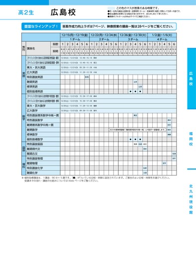 広島校福岡校北九州現役館高2生広島校この色のマスが授業のある時限です。●同一名称の講座は設置校舎・設置期間(ターム)・授業時間(時限)が異なっても同一内容です。●担当講師は変更になる場合がありますので、あらかじめご了承ください。●講師のフルネームはWebサイトでご確認ください。12/15(月)~12/19(金)12/22(月)~12/24(水)12/26(金)~12/30(火)1/2(金)~1/6(火)1ターム2ターム3ターム4ターム12345612345612345612345609:30〜11:0011:20〜12:5013:40〜15:1015:30〜17:0017:20〜18:5019:10〜20:4009:30〜11:0011:20〜12:5013:40〜15:1015:30〜17:0017:20〜18:5019:10〜20:4009:30〜11:0011:20〜12:5013:40〜15:1015:30〜17:0017:20〜18:5019:10〜20:4009:30〜11:0011:20〜12:5013:40〜15:1015:30〜17:0017:20〜18:5019:10〜20:4012/20(土)・12/21(日)13:40〜15:10岡本12/20(土)・12/21(日)13:40〜15:10坂口12/20(土)・12/21(日)09:30〜11:00小谷12/20(土)・12/21(日)11:20〜12:50小谷堤(英)12/20(土)・12/21(日)15:30〜17:00森本12/20(土)・12/21(日)15:30〜17:00鳥本12/20(土)・12/21(日)11:20〜12:50樋原12/20(土)・12/21(日)09:30〜11:00府木山添山添●●●黒田2025年度春期講習「難関理系数学中高一貫」と内容が一部重複します。鳥本森本府木真崎松浦安平安平●●●莵原・松浦・岩本岡本松原大澤時限時間講座名教科【ダイジェスト】冬から始める入試対策英語(特別選抜・難関)【ダイジェスト】冬から始める入試対策英語(難関・標準)東大・京大英語広大英語特別選抜英語難関英語標準英語個別指導英語【ダイジェスト】冬から始める入試対策数学(特別選抜・難関)【ダイジェスト】冬から始める入試対策数学(難関・標準)東大・京大数学広大数学特別選抜理系数学中高一貫特別選抜数学難関理系数学中高一貫難関数学標準数学個別指導数学特別選抜国語難関現代文難関古文特別選抜物理難関物理特別選抜化学難関化学英語数学国語理科※個別指導講座は、1講座:90分×5講です。「●」がついている日程・時限に設定されています。ご都合のよい日程・時限をお選びください。受講までの流れ・講座の仕組みについてはWebページをご覧ください。●2025年度/冬期講習/広島/広島校/高2生/パターン14452025_57_6_611_32_20250715192027.csv/1ページ校了時削除