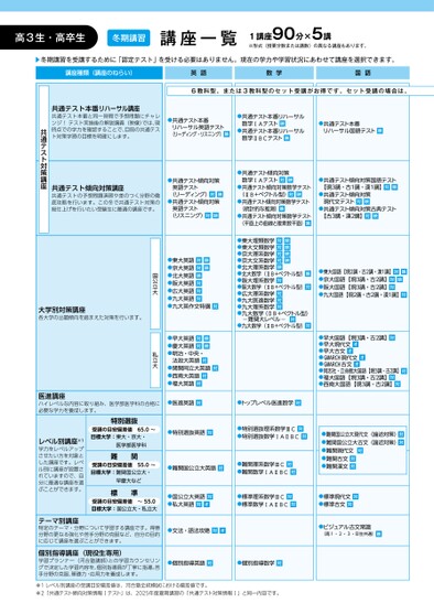 高3生・高卒生冬期講習講座一覧1講座90分×5講※形式(授業分数または講数)の異なる講座もあります。▶冬期講習を受講するために「認定テスト」を受ける必要はありません。現在の学力や学習状況にあわせて講座を選択できます。講座種類(講座のねらい)英語数学国語6教科型、または3教科型のセット受講がお得です。セット受講の場合は、●共通テスト傾向対策数学ⅠAテスト対映●共通テスト傾向対策数学テスト(ⅡB+ベクトル型)対映●共通テスト傾向対策数学テスト(統計的な推測)映●共通テスト傾向対策数学テスト(平面上の曲線と複素数平面)映●東大理類数学対映●東大文類数学対映●京大理系数学対映●京大文系数学対映●北大理系数学映●北大数学(ⅡB+ベクトル型)映●阪大理系数学対●阪大数学(ⅡB+ベクトル型)対●広大理系数学対●九大医進数学対●九大理系数学対●九大数学(ⅡB+ベクトル型)―難関大レベル―対●九大数学(ⅡB+ベクトル型)対●共通テスト傾向対策国語テスト【現3講・古1講・漢1講】対映●共通テスト傾向対策現代文テスト対映●共通テスト傾向対策古典テスト【古3講・漢2講】対映●東大国語【現2講・古2講・漢1講】対映●京大国語【現3講・古2講】対映●阪大国語【現3講・古2講】対●九大国語【現2講・古2講・漢1講】対●早大国語【現3講・古2講】対●早大現代文オ●早大古文オ●GMARCH現代文オ●GMARCH古文オ●同志社・立命館大国語【現3講・古2講】対●福大国語【現3講・古2講】対●西南大国語【現3講・古2講】対共通テスト傾向対策講座共通テストの予想問題演習や差のつく分野の徹底攻略を行います。この冬で共通テスト対策の総仕上げを行いたい受験生に最適の講座です。●共通テスト傾向対策英語テスト(リーディング)対映●共通テスト傾向対策英語テスト(リスニング)対映●東大英語対映●京大英語対映●北大英語映●阪大英語対●広大英語対●九大英語対●九大英作文特講対●早大英語対映●慶大英語対映●明治・中央・法政大英語対●関関同立大英語対●西南大英語対●福大英語対国公立大私立大大学別対策講座各大学の出題傾向を踏まえた対策を行います。共通テスト本番リハーサル講座共通テスト本番と同一時間で予想問題にチャレンジ!テスト実施後の解説講義(映像)では、現時点での学力を確認することで、目前の共通テスト対策学習の目標を明確にします。●共通テスト本番リハーサル英語テスト(リーディング・リスニング)映●共通テスト本番リハーサル数学ⅠAテスト映●共通テスト本番リハーサル数学ⅡBCテスト映●共通テスト本番リハーサル国語テスト映共通テスト対策講座医進講座ハイレベルな内容に取り組み、医学部医学科の合格に必要な学力を養成します。●医進英語対●トップレベル医進数学対レベル別講座※1学力をレベルアップさせたい方を対象とした講座です。レベル別に講座が設置されていますので、自分に最適な講座を選ぶことができます。特別選抜受講の目安偏差値65.0~目標大学:東大・京大・医学部医学科難関受講の目安偏差値55.0~目標大学:難関国公立大・早慶大など標準受講の目安偏差値~55.0目標大学:国公立大・私立大テーマ別講座特定のテーマ・分野について学習する講座です。得意分野の更なる強化や苦手分野の克服など、自分の目的に応じて講座を選ぶことができます。個別指導講座(現役生専用)学習プランナー(河合塾講師)との学習カウンセリングで決定した学習内容を、個別指導員が丁寧に指導。苦手分野の克服、基礎力・応用力を養成します。●特別選抜英語対●特別選抜理系数学ⅢC対●特別選抜数学ⅠAⅡBC対●難関国公立大英語対●難関理系数学ⅢC対●難関数学ⅠAⅡBC対●難関国公立大現代文(論述対策)対●難関国公立大古文(論述対策)対●難関現代文対●難関古文対●難関漢文対●国公立大英語対●私大英語対オ●標準理系数学ⅢC対●標準数学ⅠAⅡBC対●標準現代文対●標準古文対●文法・語法攻略対オ●ビジュアル古文常識(高1・2・3・卒生共通)映●個別指導英語対●個別指導数学対※1レベル別講座の受講目安偏差値は、河合塾全統模試における偏差値です。※2「共通テスト傾向対策情報Ⅰテスト」は、2025年度夏期講習の「共通テスト対策情報Ⅰ」と同一内容です。