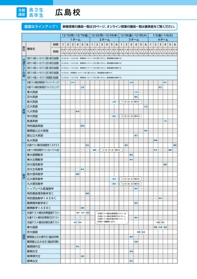 12/15(月)~12/19(金)12/22(月)~12/24(水)12/26(金)~12/30(火)1/2(金)~1/6(火)1ターム2ターム3ターム4ターム12345612345612345612345609:30〜11:0011:20〜12:5013:40〜15:1015:30〜17:0017:20〜18:5019:10〜20:4009:30〜11:0011:20〜12:5013:40〜15:1015:30〜17:0017:20〜18:5019:10〜20:4009:30〜11:0011:20〜12:5013:40〜15:1015:30〜17:0017:20〜18:5019:10〜20:4009:30〜11:0011:20〜12:5013:40〜15:1015:30〜17:0017:20〜18:5019:10〜20:40時限時間講座名共通テスト本番リハーサルテスト【理系6教科】校舎受験)共通テスト本番リハーサルテスト【文系6教科】校舎受験)共通テスト本番リハーサルテスト【理系3教科】校舎受験)共通テスト本番リハーサルテスト【文系3教科】校舎受験)共通テスト本番リハーサルテスト【英数国型】校舎受験)共通テスト傾向対策英語テスト(リーディング)共通テスト傾向対策英語テスト(リスニング)東大英語京大英語阪大英語広大英語九大英語早大英語医進英語特別選抜英語難関国公立大英語国公立大英語私大英語共通テスト傾向対策数学ⅠAテスト共通テスト傾向対策数学テスト(ⅡB+ベクトル型)東大理類数学東大文類数学京大理系数学京大文系数学阪大理系数学広大理系数学九大理系数学トップレベル医進数学特別選抜理系数学ⅢC特別選抜数学ⅠAⅡBC難関理系数学ⅢC難関数学ⅠAⅡBC共通テスト傾向対策国語テスト共通テスト傾向対策現代文テスト共通テスト傾向対策古典テスト東大国語京大国語難関国公立大現代文(論述対策)難関国公立大古文(論述対策)難関現代文難関古文標準現代文標準古文12/20(土)・12/21(日)時間割は13ページをご覧ください。解説講義は映像です。12/20(土)・12/21(日)時間割は13ページをご覧ください。解説講義は映像です。12/20(土)・12/21(日)時間割は13ページをご覧ください。解説講義は映像です。12/20(土)時間割は13ページをご覧ください。解説講義は映像です。12/20(土)・12/21(日)時間割は13ページをご覧ください。解説講義は映像です。杉本山添堤(英)堤(英)山添小谷岡本山添12/24(水)は5限のみ岡本12/24(水)は5限のみ小谷岡本坂口坂口小谷坂口堤(智)森本鳥本樋原樋原12/24(水)は1限のみ府木樋原黒田森本府木鳥本12/24(水)は5限のみ12/24(水)は5限のみ「共通テスト傾向対策国語テスト」は「共通テスト傾向対策現代文テスト」、「共通テスト傾向対策古典テスト」と内容が一部重複します。森本鳥本岡本莵原・松浦松浦莵原松浦岩本森本樋原樋原樋原岡本・岩本・寺田岩本・吉田岡本莵原樋原樋原森本松浦・寺田莵原・松浦・寺田教科共通テスト対策英語数学国語15●2025年度/冬期講習/広島/広島校/高3・卒生/パターン14452025_57_6_611_11_20250717131455.csv/1ページ校了時削除冬期講習高3生高卒生広島校
