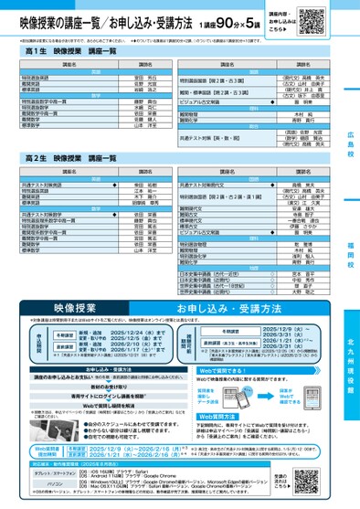 広島校福岡校北九州現役館講師名(現代文)高橋英夫(古文)山村由美子(現代文)井上真(古文)坂下由香里園明美木村純青野貴行(英語)佐野光宜(数学)原賢治(現代文)高橋英夫講師名高橋英夫(現代文)高橋英夫(古文)山村由美子(漢文)江久実安達雄大寺島智子一番合戦達也伊藤さやか園明美乾雅博木村純浅利魁人青野貴行宮本晋平中垣秀作堤直子大野聡之理科総合国語理科地歴共通テスト対策現代文♦特別選抜国語【現2講・古2講・漢1講】難関現代文難関古文標準現代文標準古文ビジュアル古文常識♦特別選抜物理難関物理特別選抜化学難関化学日本史集中講義(古代―近世)♢日本史集中講義(近現代)♢世界史集中講義(古代―18世紀)♢世界史集中講義(近現代)♢冬期講習直前講習(高3生・高卒生対象)2025/12/9(火)〜2026/3/31(火)2026/1/21(水)※2〜2026/3/31(火)※2「共通テスト本番突破テスト講座」は2025/12/25(木)から視聴開始「東大本番プレテスト」「京大本番プレテスト」は2026/2/3(火)から視聴開始視聴可能期間冬期講習直前講習新規・追加2025/12/24(水)まで変更・取りやめ2025/12/5(金)まで新規・追加2026/2/10(火)まで変更・取りやめ2026/1/17(土)※1まで※1「共通テスト本番突破テスト講座」は2025/12/21(日)まで申込期間講座のお申し込みとお支払い他の冬期・直前講習の講座と同様にお申し込みください。お申し込み・受講方法Webで質問できる!Webで映像授業の内容に関する質問ができます。教材のお受け取り専用サイトにログインし講義を視聴※Webで質問し疑問を解消※視聴方法は、申込マイページの「受講証(時間割)ー講習はこちらー」から「受講上のご案内」などをご確認ください。●自分のスケジュールにあわせて受講できます。●わからない部分は繰り返し視聴できます。●自宅での視聴も可能です。カシャ!質問書を撮影しデータ送信Web質問方法回答がWebで確認できる下記期間内に、専用サイトにてWebで質問を受け付けます。詳細は申込マイページの「受講証(時間割)ー講習はこちらー」から「受講上のご案内」をご確認ください。Web質問書提出期間冬期講習直前講習2025/12/9(火)〜2026/2/16(月)※32026/1/21(水)〜2026/2/16(月)※4※3高3生・高卒生の「共通テスト対策講座」に関する質問は、1/5(月)12:00まで。※4「共通テスト本番突破テスト講座」に関する質問の受付は行いません。対応端末・動作推奨環境(2025年8月現在)タブレット/スマートフォン【OS:iOS16以降】ブラウザ:Safari【OS:Android11以降】ブラウザ:GoogleChrome【OS:Windows10以上】ブラウザ:GoogleChromeの最新バージョン、MicrosoftEdgeの最新バージョン【OS:MacOSⅩ11.0以降】ブラウザ:Safari最新バージョン、GoogleChromeの最新バージョン※OSの将来バージョン、タブレット/スマートフォンの新機種などの対応は、動作確認が完了次第、推奨環境としてご案内していきます。パソコン受講の流れはこちら▶映像授業お申し込み・受講方法*対象講座は時間割冊子またはWebサイトをご覧ください。映像授業はオンライン授業とは異なります。映像授業の講座一覧/お申し込み・受講方法9:30〜11:0013:40〜15:1017:20〜18:50高3生高卒生直前講習時限1限3限5限時間時限2限4限6限時間1講座90分×5講11:20〜12:5015:30〜17:0019:10〜20:40ご了承ください。●同一名称の講座は設置校舎・設置期間・授業時間(時限)・授業形式(対面・映像)が異なっても同一内容です。●担当講師は変更になる場合がありますので、あらかじめ講座内容・お申し込みはこちら▶●講師のフルネームはWebサイトでご確認ください。*担当講師は変更になる場合がありますので、あらかじめご了承ください。*♦のついている講座は1講座90分×2講、♢のついている講座は1講座90分×10講です。高1生映像授業講座一覧講座名英語数学特別選抜英語難関英語標準英語特別選抜数学中高一貫特別選抜数学難関数学中高一貫難関数学標準数学講師名室田芳丘佐野光宜岩崎浩之藤野真也水嶋克仁依田栄喜佐藤健人山本洋至講座名国語特別選抜国語【現2講・古3講】難関・標準国語【現2講・古3講】ビジュアル古文常識♦難関物理難関化学共通テスト対策【英・数・現】高2生映像授業講座一覧講座名講師名講座名英語数学共通テスト対策英語♦特別選抜英語難関英語標準英語共通テスト対策数学♦特別選抜理系数学中高一貫特別選抜数学難関理系数学中高一貫難関数学中高一貫難関数学標準数学柴田祐樹江本祐一木下陽介胡摩﨑章秀依田栄喜藤野真也宮田篤志依田栄喜宮田篤志依田栄喜山本洋至