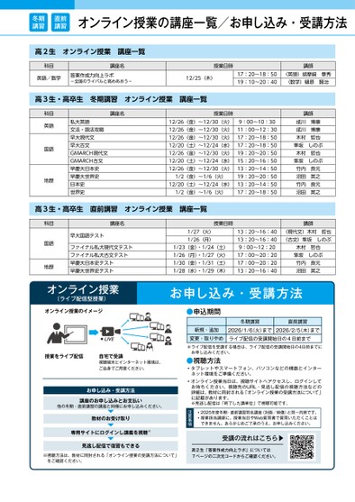 冬期講習直前講習オンライン授業の講座一覧/お申し込み・受講方法高2生オンライン授業講座一覧科目英語/数学講座名答案作成力向上ラボ-全国のライバルと高めあおう-授業日時講師12/25(木)17:20~18:5019:10~20:40(英語)胡摩﨑章秀(数学)原賢治高3生・高卒生冬期講習オンライン授業講座一覧科目英語国語地歴講座名私大英語文法・語法攻略早大現代文早大古文GMARCH現代文GMARCH古文早慶大日本史早慶大世界史日本史世界史授業日時12/26(金)~12/30(火)12/26(金)~12/30(火)12/26(金)~12/30(火)12/20(土)~12/24(水)12/26(金)~12/30(火)12/20(土)~12/24(水)12/26(金)~12/30(火)1/2(金)~1/6(火)12/20(土)~12/24(水)1/2(金)~1/6(火)9:00~10:3011:00~12:3017:20~18:5017:20~18:5019:20~20:5015:20~16:5013:20~14:5019:20~20:5013:20~14:5017:20~18:50講師成川博康成川博康木村哲也隼坂しのぶ木村哲也隼坂しのぶ竹内良元沼田英之竹内良元沼田英之高3生・高卒生直前講習オンライン授業講座一覧科目国語地歴講座名早大国語テストファイナル私大現代文テストファイナル私大古文テスト早慶大日本史テスト早慶大世界史テストオンライン授業(ライブ配信型授業)オンライン授業のイメージILVE授業をライブ配信自宅で受講視聴端末とインターネット環境は、ご自身でご用意ください。授業日時1/27(火)1/26(月)1/23(金)・1/24(土)1/26(月)・1/27(火)1/30(金)・1/31(土)1/28(水)・1/29(木)13:20~16:4013:20~16:409:00~12:2017:00~20:2017:00~20:2013:20~16:40講師(現代文)木村哲也(古文)隼坂しのぶ木村哲也隼坂しのぶ竹内良元沼田英之お申し込み・受講方法●申込期間冬期講習直前講習新規・追加変更・取りやめ2026/1/6(火)までライブ配信の受講開始日の4日前まで2026/2/5(木)まで※ライブ配信を受講する場合は、ライブ配信の受講開始日の4日前までにお申し込みください。●視聴方法タブレットやスマートフォン、パソコンなどの機器とインターネット環境をご準備ください。オンライン授業当日は、視聴サイトへアクセスし、ログインしてお待ちください。視聴先のURL・見逃し配信の視聴方法などの詳細は、教材に同封される「オンライン授業の受講方法について」に記載があります。※見逃し配信は「終了した講単位」で視聴可能です。2025年度冬期・直前講習同名講座(対面/映像)と同一内容です。授業担当講師に、授業当日やWeb質問書で質問いただくことはできません。あらかじめご了承のうえ、お申し込みください。注意事項受講の流れはこちら▶高2生「答案作成力向上ラボ」については7ページの二次元コードからご確認ください。お申し込み・受講方法講座のお申し込みとお支払い他の冬期・直前講習の講座と同様にお申し込みください。教材のお受け取り専用サイトにログインし講義を視聴※見逃し配信で復習もできる※視聴方法は、教材に同封される「オンライン授業の受講方法について」をご確認ください。