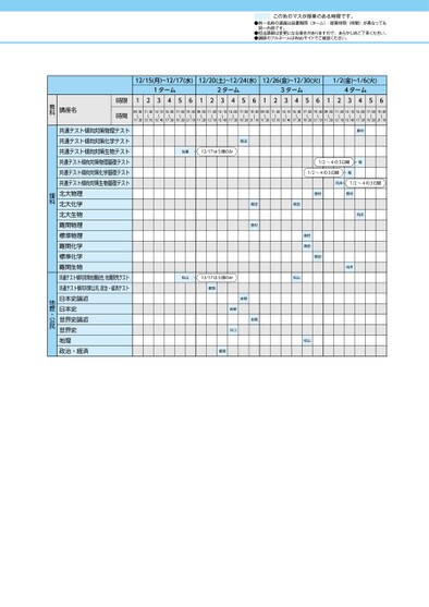 この色のマスが授業のある時限です。●同一名称の講座は設置期間(ターム)・授業時間(時限)が異なっても同一内容です。●担当講師は変更になる場合がありますので、あらかじめご了承ください。●講師のフルネームはWebサイトでご確認ください。12/15(月)~12/17(水)12/20(土)~12/24(水)12/26(金)~12/30(火)1/2(金)~1/6(火)1ターム2ターム3ターム4ターム12345612345612345612345609:50〜11:2011:40〜13:1014:10〜15:4016:00〜17:3017:50〜19:2019:40〜21:1009:50〜11:2011:40〜13:1014:10〜15:4016:00〜17:3017:50〜19:2019:40〜21:1009:50〜11:2011:40〜13:1014:10〜15:4016:00〜17:3017:50〜19:2019:40〜21:1009:50〜11:2011:40〜13:1014:10〜15:4016:00〜17:3017:50〜19:2019:40〜21:10高田佐藤12/17は5限のみ高田高田島村松山12/17は5限のみ松山吉野本間吉野川口都築都築島村1/2~4の3日間堀1/2~4の3日間堀向井1/2~4の3日間島村島村向井向井島村高田高田松山時限時間講座名教科共通テスト傾向対策物理テスト共通テスト傾向対策化学テスト共通テスト傾向対策生物テスト共通テスト傾向対策物理基礎テスト共通テスト傾向対策化学基礎テスト共通テスト傾向対策生物基礎テスト北大物理北大化学北大生物難関物理標準物理難関化学標準化学難関生物共通テスト傾向対策地理総合,地理探究テスト共通テスト傾向対策公共,政治・経済テスト日本史論述日本史世界史論述世界史地理政治・経済理科地歴・公民