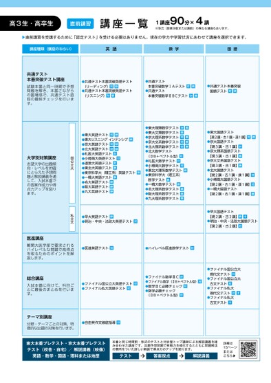 共通テスト本番突破テスト講座試験本番と同一時間で予想問題を解き、本番さながらの臨場感で、共通テスト直前の最終チェックを行います。●共通テスト本番突破英語テスト(リーディング)対映●共通テスト本番突破英語テスト(リスニング)対映●共通テスト本番突破数学ⅠAテスト対映●共通テスト本番突破数学ⅡBCテスト対映●共通テスト本番突破国語テスト対映●東大国語テスト【現2講・古1講・漢1講】対映●京大国語テスト【現3講・古1講】対●京大理系国語テスト【現3講・古1講】映●京大文系国語テスト【現3講・古1講】映●北大国語テスト【現2講・古1講・漢1講】対●小樽商大国語テスト【現2講・古1講・漢1講】対●一橋大国語テスト【現2講・古1講・漢1講】映●早大国語テスト【現2講・古2講】映オ●明治・中央・法政大国語テスト【現2講・古2講】対●東大英語テスト対映●東大リスニングインテンシブ映●京大英語テスト対映●北大英語テスト対映●札医大英語テスト対●小樽商大英語テスト対●道教大英語テスト対●東北大英語テスト映●東京科学大(理工系)英語テスト映●一橋大英語テスト映●名大英語テスト映●阪大英語テスト映●九大英語テスト映●東大理類数学テスト対映●東大文類数学テスト映●京大理系数学テスト対映●京大文系数学テスト対映●北大理系数学テスト対映●北大数学テスト(ⅡB+ベクトル型)対●札医大数学テスト対●小樽商大数学テスト対●東北大理系数学テスト映●東京科学大(理工系)数学テスト映●一橋大数学テスト映●名大理系数学テスト映●阪大理系数学テスト映●九大理系数学テスト映国公立大大学別対策講座志望大学の出題傾向・レベルを的確にとらえた予想問題と解説講義を通して、入試本番での答案作成力や得点力アップを図ります。●早大英語テスト映●明治・中央・法政大英語テスト対私立大医進講座難関大医学部で要求されるハイレベルな問題で高得点を取るためのポイントを解説します。総合講座入試本番に向けて、科目ごとに最後のまとめを行います。●医進英語テスト対●ハイレベル医進数学テスト対●ファイナル国公立大英語テスト対●ファイナル私大英語テスト対●ファイナル数学ⅢC対●ファイナル数学(ⅡB+ベクトル型)対●数学ⅢC必勝チェック対●数学必勝チェック(ⅡB+ベクトル型)対●ファイナル国公立大現代文テスト対●ファイナル国公立大古文テスト対●ファイナル私大現代文テスト対オ●ファイナル私大古文テストオテーマ別講座分野・テーマごとの対策、特徴的な出題の対策を行います。●自由英作文徹底指導対高3生・高卒生直前講習講座一覧1講座90分×4講※形式(授業分数または講数)の異なる講座もあります。▶直前講習を受講するために「認定テスト」を受ける必要はありません。現在の学力や学習状況にあわせて講座を選択できます。講座種類(講座のねらい)英語数学国語東大本番プレテスト・京大本番プレテストテスト(校舎・自宅)/解説講義(映像)英語・数学・国語・理科または地歴本番と同じ時間割・形式のテストと河合塾トップ講師による解説講義を組み合わせた講座です。出題予想問題で実戦力を強化するとともに問題解法の要所をついた詳しい解説で得点力のアップを図ります。テスト答案採点解説講義詳細は15ページまたはこちら▶