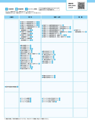 対対面授業映映像授業オオンライン授業デジタル端末などを使ったオンライン上で受講できるライブ型の授業です。*オンライン授業のお申し込み・受講方法は18ページをご覧ください。*映像授業のお申し込み・受講方法は19ページ、講座一覧は21ページをご覧ください。講座内容・お申し込みはこちら▶小論文理科地歴・公民情報●共通テスト本番突破物理テスト対映●共通テスト本番突破化学テスト対映●共通テスト本番突破生物テスト対映●共通テスト本番突破地学テスト映●共通テスト本番突破物理基礎テスト対映●共通テスト本番突破化学基礎テスト対映●共通テスト本番突破生物基礎テスト対映●共通テスト本番突破地学基礎テスト対映●東大物理テスト映●京大物理テスト映●北大物理テスト対映●札医大物理テスト対●東北大物理テスト映●東京科学大(理工系)物理テスト映●東大化学テスト映●京大化学テスト映●北大化学テスト対映●札医大化学テスト対●東北大化学テスト映●東京科学大(理工系)化学テスト映●東大生物テスト映●北大生物テスト対映●札医大生物テスト対●共通テスト本番突破歴史総合テスト映●共通テスト本番突破歴史総合,日本史探究テスト映●共通テスト本番突破歴史総合,世界史探究テスト映●共通テスト本番突破地理総合テスト映●共通テスト本番突破地理総合,地理探究テスト対映●共通テスト本番突破公共テスト映●共通テスト本番突破公共,倫理テスト対映●共通テスト本番突破公共,政治・経済テスト対映●共通テスト本番突破情報Ⅰテスト映●東大日本史テスト映●京大日本史テスト映●一橋大日本史テスト映●東大世界史テスト映●京大世界史テスト映●一橋大世界史テスト映●東大地理テスト映●京大地理テスト映●早慶大日本史テストオ●早慶大世界史テストオ●医学科面接対策講座対●ファイナル物理対●ファイナル化学対●ハイレベル生物対●ファイナル私大日本史テスト対●ファイナル私大世界史テスト対●ファイナル政治・経済対*講座の詳細、内容の重複などについては、Webサイトの講座一覧よりご確認ください。