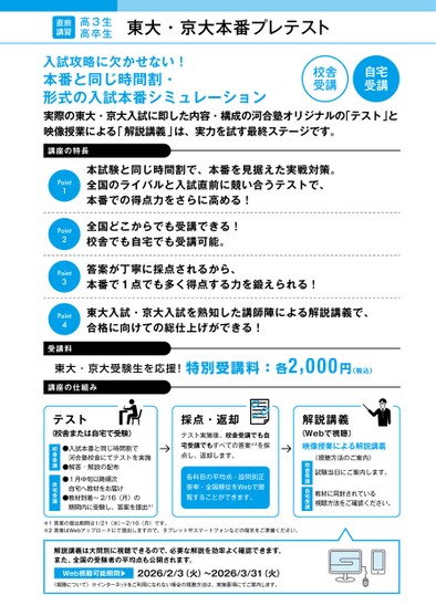 直前講習高3生高卒生東大・京大本番プレテスト入試攻略に欠かせない!本番と同じ時間割・形式の入試本番シミュレーション実際の東大・京大入試に即した内容・構成の河合塾オリジナルの「テスト」と映像授業による「解説講義」は、実力を試す最終ステージです。自宅受講校舎受講講座の特長本試験と同じ時間割で、本番を見据えた実戦対策。全国のライバルと入試直前に競い合うテストで、本番での得点力をさらに高める!全国どこからでも受講できる!校舎でも自宅でも受講可能。答案が丁寧に採点されるから、本番で1点でも多く得点する力を鍛えられる!東大入試・京大入試を熟知した講師陣による解説講義で、合格に向けての総仕上げができる!Point1Point2Point3Point4受講料東大・京大受験生を応援!特別受講料:各2,000円(税込)講座の仕組み解説講義(Webで視聴)映像授業による解説講義視聴方法のご案内試験当日にご案内します。教材に同封されている視聴方法をご確認ください。校舎受講自宅受講採点・返却テスト実施後、校舎受講でも自宅受講でもすべての答案※2を採点し、返却します。各科目の平均点・設問別正答率・全国順位をWebで閲覧することができます。●入試本番と同じ時間割で河合塾校舎にてテストを実施●解答・解説の配布●1月中旬以降順次自宅へ教材をお届け●教材到着〜2/16(月)の期間内に受験し、答案を提出※1校舎受講自宅受講テスト(校舎または自宅で受験)※1答案の提出期間は1/21(水)〜2/16(月)です。※2答案はWebアップロードにて提出しますので、タブレットやスマートフォンなどの端末をご準備ください。解説講義は大問別に視聴できるので、必要な解説を効率よく確認できます。また、全国の受験者の平均点も公開されます。Web視聴可能期間▶2026/2/3(火)〜2026/3/31(火)〈視聴について〉※インターネットをご利用になれない場合の視聴方法は、実施要項にてご案内します。