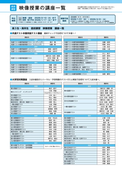 直前講習映像授業の講座一覧*担当講師は変更になる場合がありますので、あらかじめご了承ください。*講数・分数は講座により異なります。Webサイトをご確認ください。申込期間新規・追加2026/2/10(火)まで変更・取りやめ2026/1/17(土)※まで直前講習※「共通テスト本番突破テスト講座」は2025/12/21(日)まで視聴可能期間直前講習(高3生・高卒生対象)2026/1/21(水)〜2026/3/31(火)※「共通テスト本番突破テスト講座」は2025/12/25(木)から視聴開始「東大本番プレテスト」「京大本番プレテスト」は2026/2/3(火)から視聴開始高3生・高卒生直前講習映像授業講座一覧●共通テスト本番突破テスト講座最終チェックで自信をつけて本番へ!講座名共通テスト本番突破英語テスト(リーディング)共通テスト本番突破英語テスト(リスニング)共通テスト本番突破数学ⅠAテスト共通テスト本番突破数学ⅡBCテスト英語数学国語共通テスト本番突破国語テスト共通テスト本番突破物理テスト共通テスト本番突破化学テスト共通テスト本番突破生物テスト共通テスト本番突破地学テスト理科講師名清川舞加藤剛高梨由多可高梨由多可(現代文)光田鮎美(古文)阿部順(漢文)伊藤恭平加藤武昭岡島卓也三浦友史田島一成講座名理科共通テスト本番突破物理基礎テスト共通テスト本番突破化学基礎テスト共通テスト本番突破生物基礎テスト共通テスト本番突破地学基礎テスト地歴・公民共通テスト本番突破歴史総合テスト共通テスト本番突破歴史総合,日本史探究テスト共通テスト本番突破歴史総合,世界史探究テスト共通テスト本番突破地理総合テスト共通テスト本番突破地理総合,地理探究テスト共通テスト本番突破公共テスト共通テスト本番突破公共,倫理テスト共通テスト本番突破公共,政治・経済テスト共通テスト本番突破情報Ⅰテスト情報●大学別対策講座入試本番前のリハーサル!予想問題のテストゼミと解説で自信をつけて入試本番へ。講師名加藤武昭岡島卓也三浦友史田島一成井上徳子田中信司坂本新一中井隆顕中井隆顕吉見直倫平川唯史河合英次加賀健司講師名(現代文)斎藤淳(古文)藤澤咲良(漢文)髙橋佳典(現代文)中崎学(古文)松尾佳津子(現代文)中崎学(古文)松尾佳津子(現代文)三河隆之(古文)園明美(漢文)髙橋佳典(現代文)一瀬文孝(古文)阿部順小野仁彦乾雅博島村誠渡部大嗣合田哲也寺田大介西章嘉寺田大介寺田大介安達弘行向井亮向井亮坂本勝義宮本晋平依田文人坂本新一井上徳子矢野文明伊藤彰芳河野貴樹講座名英語東大英語テスト東大リスニングインテンシブ京大英語テスト北大英語テスト東北大英語テスト東京科学大(理工系)英語テスト一橋大英語テスト名大英語テスト阪大英語テスト九大英語テスト早大英語テスト東大理類数学テスト東大文類数学テスト京大理系数学テスト京大文系数学テスト北大理系数学テスト東北大理系数学テスト東京科学大(理工系)数学テスト一橋大数学テスト名大理系数学テスト阪大理系数学テスト九大理系数学テスト東大本番プレテスト(自宅受験)京大本番プレテスト(自宅受験)数学総合ジョナサン・マクフィー講師名高沢節子久恒秀雄江本祐一松山博史竹内利光仲野秀人久恒秀雄宮下卓也胡摩﨑章秀柴田祐樹髙橋慶刈谷今比古岡田純一西浦高志藤野真也福井敏英木村文彦香坂季京飯田忠司小田裕介瀬戸山義治清水脩平16ページをご覧ください。講座名国語東大国語テスト京大理系国語テスト京大文系国語テスト一橋大国語テスト早大国語テスト理科地歴東大物理テスト京大物理テスト北大物理テスト東北大物理テスト東京科学大(理工系)物理テスト東大化学テスト京大化学テスト北大化学テスト東北大化学テスト東京科学大(理工系)化学テスト東大生物テスト北大生物テスト東大日本史テスト京大日本史テスト一橋大日本史テスト東大世界史テスト京大世界史テスト一橋大世界史テスト東大地理テスト京大地理テスト