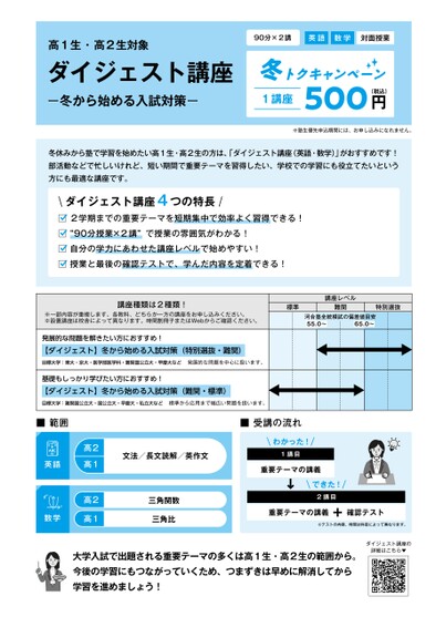 高1生・高2生対象ダイジェスト講座冬から始める入試対策90分×2講英語数学対面授業冬トクキャンペーン円(税込)5001講座冬休みから塾で学習を始めたい高1生・高2生の方は、「ダイジェスト講座(英語・数学)」がおすすめです!部活動などで忙しいけれど、短い期間で重要テーマを習得したい、学校での学習にも役立てたいという方にも最適な講座です。※塾生優先申込期間には、お申し込みになれません。ダイジェスト講座4つの特長□2学期までの重要テーマを短期集中で効率よく習得できる!□“90分授業×2講”□自分の学力にあわせた講座レベルで始めやすい!□授業と最後の確認テストで、学んだ内容を定着できる!で授業の雰囲気がわかる!標準講座レベル難関特別選抜河合塾全統模試の偏差値目安65.0〜55.0〜講座種類は2種類!※一部内容が重複します。各教科、どちらか一方の講座をお申し込みください。※設置講座は校舎によって異なります。時間割冊子またはWebからご確認ください。発展的な問題を解きたい方におすすめ!ダイジェスト】冬から始める入試対策(特別選抜・難関)目標大学:東大・京大・医学部医学科・難関国公立大・早慶大など発展的な問題を中心に扱います。基礎もしっかり学びたい方におすすめ!ダイジェスト】冬から始める入試対策(難関・標準)目標大学:難関国公立大・国公立大・早慶大・私立大など標準から応用まで幅広い問題を扱います。■範囲英語数学高2高1高2高1文法/長文読解/英作文三角関数三角比■受講の流れわかった!1講目重要テーマの講義できた!2講目重要テーマの講義確認テスト※テストの内容、時間は科目によって異なります。大学入試で出題される重要テーマの多くは高1生・高2生の範囲から。今後の学習にもつながっていくため、つまずきは早めに解消してから学習を進めましょう!ダイジェスト講座の詳細はこちら▼