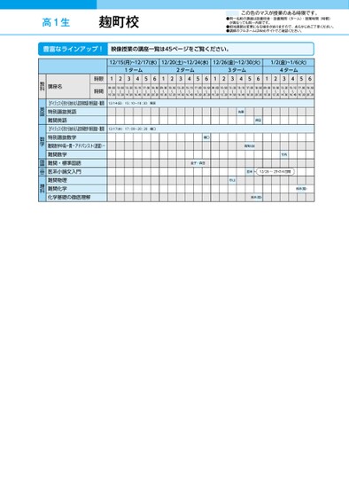 ●同一名称の講座は設置校舎・設置期間(ターム)・授業時間(時限)が異なっても同一内容です。●担当講師は変更になる場合がありますので、あらかじめご了承ください。●講師のフルネームはWebサイトでご確認ください。この色のマスが授業のある時限です。高1生●同一名称の講座は設置校舎・設置期間(ターム)・授業時間(時限)が異なっても同一内容です。●担当講師は変更になる場合がありますので、あらかじめご了承ください。●講師のフルネームはWebサイトでご確認ください。この色のマスが授業のある時限です。高1生12/15(月)~12/17(水)12/20(土)~12/24(水)12/26(金)~12/30(火)1/2(金)~1/6(火)1ターム2ターム3ターム4ターム12345612345612345612345609:00〜10:3010:50〜12:2013:20〜14:5015:10〜16:4017:00〜18:3018:50〜20:2009:00〜10:3010:50〜12:2013:20〜14:5015:10〜16:4017:00〜18:3018:50〜20:2009:00〜10:3010:50〜12:2013:20〜14:5015:10〜16:4017:00〜18:3018:50〜20:2009:00〜10:3010:50〜12:2013:20〜14:5015:10〜16:4017:00〜18:3018:50〜20:20時限時間講座名12/14(日)15:10〜18:30栗原12/17(水)17:00〜20:20樋口口【ダイジェスト】冬から始める入試対策英語(特別選抜・難関)特別選抜英語難関英語【ダイジェスト】冬から始める入試対策数学(特別選抜・難関)特別選抜数学難関数学中高一貫-アドバンスト(速習)-難関数学難関・標準国語医系小論文入門難関物理難関化学化学基礎の徹底理解口金子・森田佐藤押田高梨(由)竹内田本12/26~29の4日間杉山鈴木(翔)鈴木(翔)教科英語数学国語小論文理科麹町校●2025年度/冬期講習/東日本/麹町/高1生/パターン14452025_57_3_328_31_20250714093506.csv/1ページ校了時削除