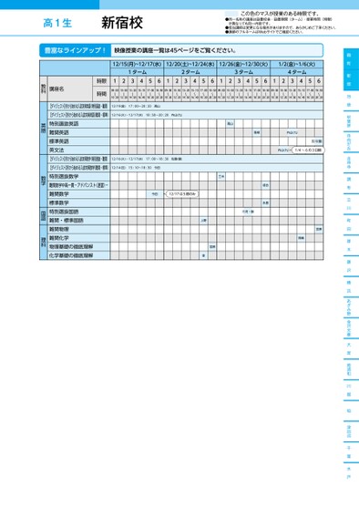 ●同一名称の講座は設置校舎・設置期間(ターム)・授業時間(時限)が異なっても同一内容です。●担当講師は変更になる場合がありますので、あらかじめご了承ください。●講師のフルネームはWebサイトでご確認ください。この色のマスが授業のある時限です。高1生●同一名称の講座は設置校舎・設置期間(ターム)・授業時間(時限)が異なっても同一内容です。●担当講師は変更になる場合がありますので、あらかじめご了承ください。●講師のフルネームはWebサイトでご確認ください。この色のマスが授業のある時限です。高1生麹町新宿池袋秋葉原自由が丘吉祥寺調布立川町田厚木藤沢横浜あざみ野金沢文庫大宮南浦和川越柏津田沼千葉水戸12/15(月)~12/17(水)12/20(土)~12/24(水)12/26(金)~12/30(火)1/2(金)~1/6(火)1ターム2ターム3ターム4ターム12345612345612345612345609:00〜10:3010:50〜12:2013:20〜14:5015:10〜16:4017:00〜18:3018:50〜20:2009:00〜10:3010:50〜12:2013:20〜14:5015:10〜16:4017:00〜18:3018:50〜20:2009:00〜10:3010:50〜12:2013:20〜14:5015:10〜16:4017:00〜18:3018:50〜20:2009:00〜10:3010:50〜12:2013:20〜14:5015:10〜16:4017:00〜18:3018:50〜20:2012/19(金)17:00〜20:20高山12/16(火)・12/17(水)18:50〜20:20内山(九)12/16(火)・12/17(水)17:00〜18:30佐藤(健)12/14(日)15:10〜18:30今田今田12/17は5限のみ高山青柳内山(九)吉川(量)内山(九)1/4~6の3日間三木成合永島三河・園上野宮原金宮原岡島時限時間講座名教科【ダイジェスト】冬から始める入試対策英語(特別選抜・難関)【ダイジェスト】冬から始める入試対策英語(難関・標準)特別選抜英語難関英語標準英語英文法【ダイジェスト】冬から始める入試対策数学(特別選抜・難関)【ダイジェスト】冬から始める入試対策数学(難関・標準)特別選抜数学難関数学中高一貫-アドバンスト(速習)-難関数学標準数学特別選抜国語難関・標準国語難関物理難関化学物理基礎の徹底理解化学基礎の徹底理解英語数学国語理科新宿校●2025年度/冬期講習/東日本/新宿/高1生/パターン14452025_57_3_329_31_20250717094046.csv/1ページ校了時削除