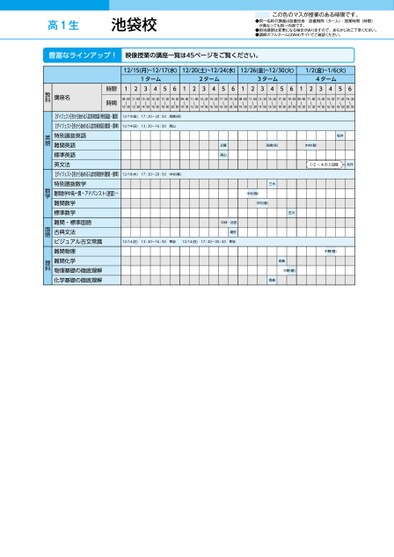 ●同一名称の講座は設置校舎・設置期間(ターム)・授業時間(時限)が異なっても同一内容です。●担当講師は変更になる場合がありますので、あらかじめご了承ください。●講師のフルネームはWebサイトでご確認ください。この色のマスが授業のある時限です。高1生●同一名称の講座は設置校舎・設置期間(ターム)・授業時間(時限)が異なっても同一内容です。●担当講師は変更になる場合がありますので、あらかじめご了承ください。●講師のフルネームはWebサイトでご確認ください。この色のマスが授業のある時限です。高1生12/15(月)~12/17(水)12/20(土)~12/24(水)12/26(金)~12/30(火)1/2(金)~1/6(火)1ターム2ターム3ターム4ターム12345612345612345612345609:00〜10:3011:00〜12:3013:20〜14:5015:20〜16:5017:20〜18:5019:20〜20:5009:00〜10:3011:00〜12:3013:20〜14:5015:20〜16:5017:20〜18:5019:20〜20:5009:00〜10:3011:00〜12:3013:20〜14:5015:20〜16:5017:20〜18:5019:20〜20:5009:00〜10:3011:00〜12:3013:20〜14:5015:20〜16:5017:20〜18:5019:20〜20:5012/19(金)17:20〜20:50髙橋(保)12/14(日)13:20〜16:50高山12/18(木)17:20〜20:50中村(隆)髙橋(保)木村(智)桜井1/2~4の3日間矢作三木中村(隆)中村(隆)古川近藤高山中林・品田福田12/14(日)13:20〜16:50隼坂12/14(日)17:20〜20:50隼坂中野(喜)岡島中野(喜)岡島時限時間講座名教科【ダイジェスト】冬から始める入試対策英語(特別選抜・難関)【ダイジェスト】冬から始める入試対策英語(難関・標準)特別選抜英語難関英語標準英語英文法【ダイジェスト】冬から始める入試対策数学(難関・標準)特別選抜数学難関数学中高一貫-アドバンスト(速習)-難関数学標準数学難関・標準国語古典文法ビジュアル古文常識難関物理難関化学物理基礎の徹底理解化学基礎の徹底理解英語数学国語理科池袋校●2025年度/冬期講習/東日本/池袋/高1生/パターン14452025_57_3_314_31_20250714093506.csv/1ページ校了時削除