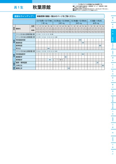 ●同一名称の講座は設置校舎・設置期間(ターム)・授業時間(時限)が異なっても同一内容です。●担当講師は変更になる場合がありますので、あらかじめご了承ください。●講師のフルネームはWebサイトでご確認ください。この色のマスが授業のある時限です。高1生●同一名称の講座は設置校舎・設置期間(ターム)・授業時間(時限)が異なっても同一内容です。●担当講師は変更になる場合がありますので、あらかじめご了承ください。●講師のフルネームはWebサイトでご確認ください。この色のマスが授業のある時限です。高1生麹町新宿池袋秋葉原自由が丘吉祥寺調布立川町田厚木藤沢横浜あざみ野金沢文庫大宮南浦和川越柏津田沼千葉水戸12/15(月)~12/17(水)12/20(土)~12/24(水)12/26(金)~12/30(火)1/2(金)~1/6(火)1ターム2ターム3ターム4ターム12345612345612345612345609:00〜10:3010:50〜12:2013:20〜14:5015:10〜16:4017:00〜18:3018:50〜20:2009:00〜10:3010:50〜12:2013:20〜14:5015:10〜16:4017:00〜18:3018:50〜20:2009:00〜10:3010:50〜12:2013:20〜14:5015:10〜16:4017:00〜18:3018:50〜20:2009:00〜10:3010:50〜12:2013:20〜14:5015:10〜16:4017:00〜18:3018:50〜20:2012/14(日)13:20〜16:40吉川(量)12/16(火)12/15(月)・(18:50〜20:20礒貝礒貝12/21(日)12/20(土)・18:50〜20:20夏川夏川島田12/17は5限のみ大澤森(博)岩間郷田礒貝上野福田時限時間講座名教科【ダイジェスト】冬から始める入試対策英語(特別選抜・難関)【ダイジェスト】冬から始める入試対策英語(難関・標準)特別選抜英語難関英語標準英語英文法【ダイジェスト】冬から始める入試対策数学(難関・標準)特別選抜数学難関数学標準数学難関・標準国語古典文法難関化学英語数学国語理科秋葉原館●2025年度/冬期講習/東日本/秋葉原/高1生/パターン14452025_57_3_368_31_20250717090203.csv/1ページ校了時削除