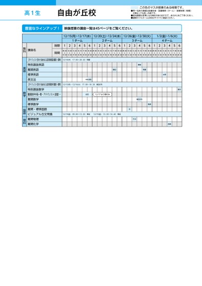 ●同一名称の講座は設置校舎・設置期間(ターム)・授業時間(時限)が異なっても同一内容です。●担当講師は変更になる場合がありますので、あらかじめご了承ください。●講師のフルネームはWebサイトでご確認ください。この色のマスが授業のある時限です。高1生●同一名称の講座は設置校舎・設置期間(ターム)・授業時間(時限)が異なっても同一内容です。●担当講師は変更になる場合がありますので、あらかじめご了承ください。●講師のフルネームはWebサイトでご確認ください。この色のマスが授業のある時限です。高1生12/15(月)~12/17(水)12/20(土)~12/24(水)12/26(金)~12/30(火)1/2(金)~1/6(火)1ターム2ターム3ターム4ターム12345612345612345612345609:00〜10:3010:50〜12:2013:20〜14:5015:10〜16:4017:00〜18:3018:50〜20:2009:00〜10:3010:50〜12:2013:20〜14:5015:10〜16:4017:00〜18:3018:50〜20:2009:00〜10:3010:50〜12:2013:20〜14:5015:10〜16:4017:00〜18:3018:50〜20:2009:00〜10:3010:50〜12:2013:20〜14:5015:10〜16:4017:00〜18:3018:50〜20:20時限時間講座名【ダイジェスト】冬から始める入試対策英語(難関・標準)特別選抜英語難関英語標準英語英文法【ダイジェスト】冬から始める入試対策数学(難関・標準)特別選抜数学難関数学中高一貫-アドバンスト(速習)-難関数学標準数学難関・標準国語ビジュアル古文常識難関物理難関化学12/18(木)17:00〜20:20明慶藤田瀬﨑明慶木村(智)12/15(月)・12/16(火)17:00〜18:30高田(宇)合田12/17は5限のみ12/19(金)09:00〜12:20隼坂12/19(金)13:20〜16:40隼坂高田(宇)福島中竹中水野國分西尾教科英語数学国語理科自由が丘校●2025年度/冬期講習/東日本/自由が丘/高1生/パターン14452025_57_3_337_31_20250717090203.csv/1ページ校了時削除