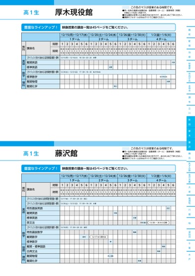●同一名称の講座は設置校舎・設置期間(ターム)・授業時間(時限)が異なっても同一内容です。●担当講師は変更になる場合がありますので、あらかじめご了承ください。●講師のフルネームはWebサイトでご確認ください。この色のマスが授業のある時限です。高1生●同一名称の講座は設置校舎・設置期間(ターム)・授業時間(時限)が異なっても同一内容です。●担当講師は変更になる場合がありますので、あらかじめご了承ください。●講師のフルネームはWebサイトでご確認ください。この色のマスが授業のある時限です。高1生厚木現役館麹町新宿池袋秋葉原自由が丘吉祥寺調布立川町田厚木藤沢横浜あざみ野金沢文庫大宮南浦和川越柏津田沼千葉水戸12/15(月)~12/17(水)12/20(土)~12/24(水)12/26(金)~12/30(火)1/2(金)~1/6(火)1ターム2ターム3ターム4ターム12345612345612345612345609:00〜10:3010:50〜12:2013:20〜14:5015:10〜16:4017:00〜18:3018:50〜20:2009:00〜10:3010:50〜12:2013:20〜14:5015:10〜16:4017:00〜18:3018:50〜20:2009:00〜10:3010:50〜12:2013:20〜14:5015:10〜16:4017:00〜18:3018:50〜20:2009:00〜10:3010:50〜12:2013:20〜14:5015:10〜16:4017:00〜18:3018:50〜20:20時限時間講座名12/15(月)・12/16(火)18:50〜20:20水野12/20(土)・12/21(日)17:00〜18:30佐々木(夫)【ダイジェスト】冬から始める入試対策英語(難関・標準)難関英語標準英語【ダイジェスト】冬から始める入試対策数学(難関・標準)標準数学難関物理難関化学水野早川犬塚佐々木(夫)矢野教科英語数学理科藤沢館12/15(月)~12/17(水)12/20(土)~12/24(水)12/26(金)~12/30(火)1/2(金)~1/6(火)1ターム2ターム3ターム4ターム12345612345612345612345609:00〜10:3010:50〜12:2013:20〜14:5015:10〜16:4017:00〜18:3018:50〜20:2009:00〜10:3010:50〜12:2013:20〜14:5015:10〜16:4017:00〜18:3018:50〜20:2009:00〜10:3010:50〜12:2013:20〜14:5015:10〜16:4017:00〜18:3018:50〜20:2009:00〜10:3010:50〜12:2013:20〜14:5015:10〜16:4017:00〜18:3018:50〜20:2012/17(水)17:00〜20:20田口12/20(土)・12/21(日)17:00〜18:30犬塚12/18(木)17:00〜20:20岩村岩村12/17は5限のみ中島堺井上(順)田口木村(智)12/28~30の3日間犬塚福島税田税田安達時限時間講座名教科【ダイジェスト】冬から始める入試対策英語(特別選抜・難関)【ダイジェスト】冬から始める入試対策英語(難関・標準)特別選抜英語難関英語標準英語英文法【ダイジェスト】冬から始める入試対策数学(難関・標準)特別選抜数学難関数学標準数学難関・標準国語古典文法難関物理難関化学英語数学国語理科豊富なラインアップ!映像授業の講座一覧は45ページをご覧ください。●2025年度/冬期講習/東日本/厚木/高1生/パターン14452025_57_3_332_31_20250717090203.csv/1ページ校了時削除